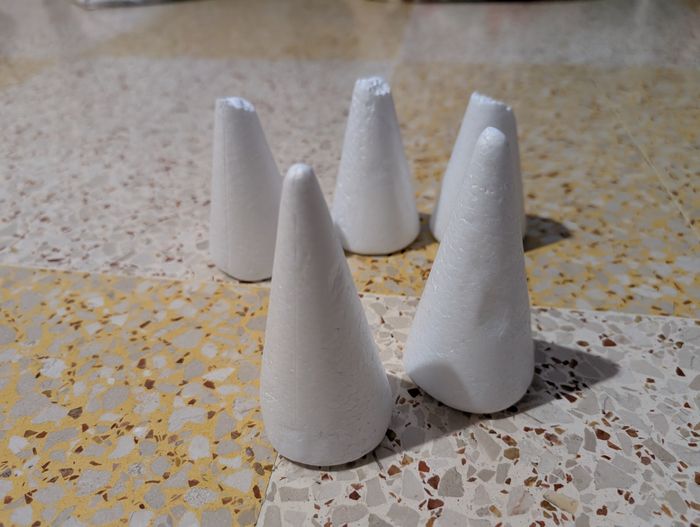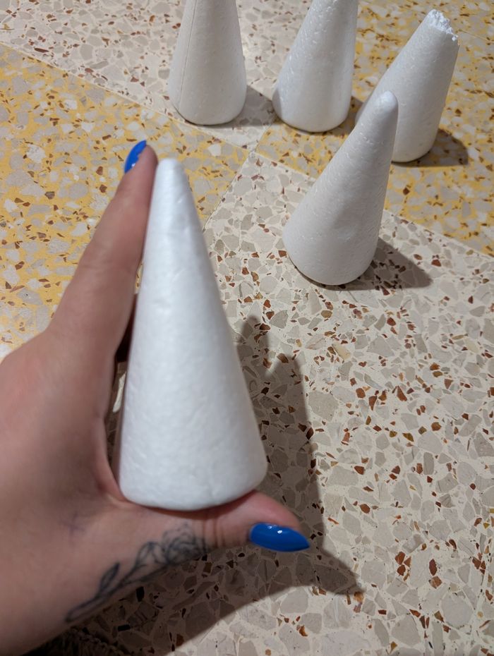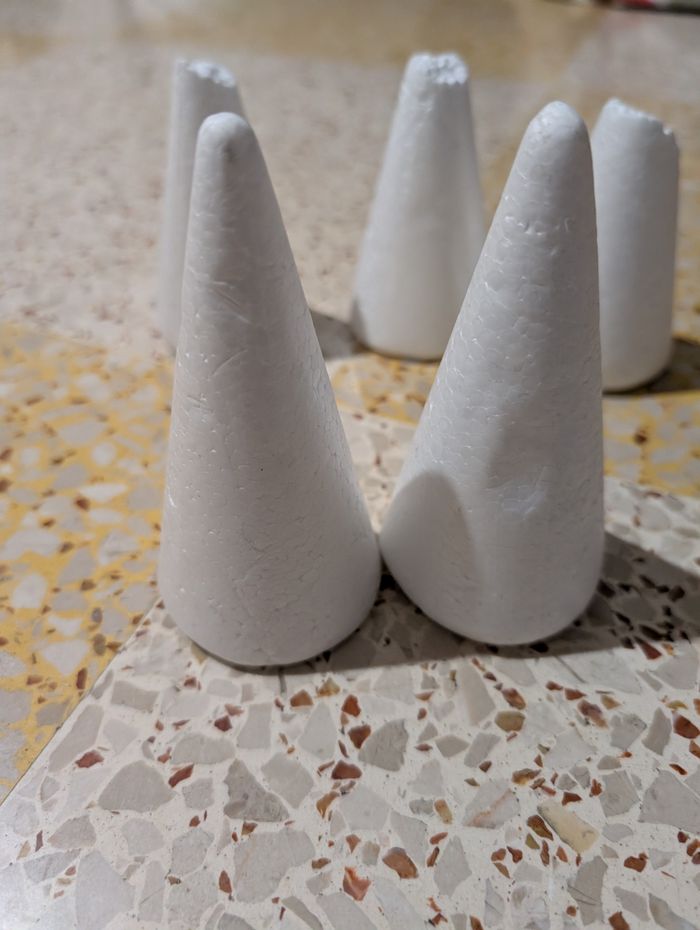 Bonjour je vends ce lot de cônes en polystyrène neufs mais abîmés au bout, qui peuvent quand même servir pour deco de table par exemple si vous plantez des choses dedans (fromage, chocolats, bonbons...) voir photos vous achetez ce que vous voyez