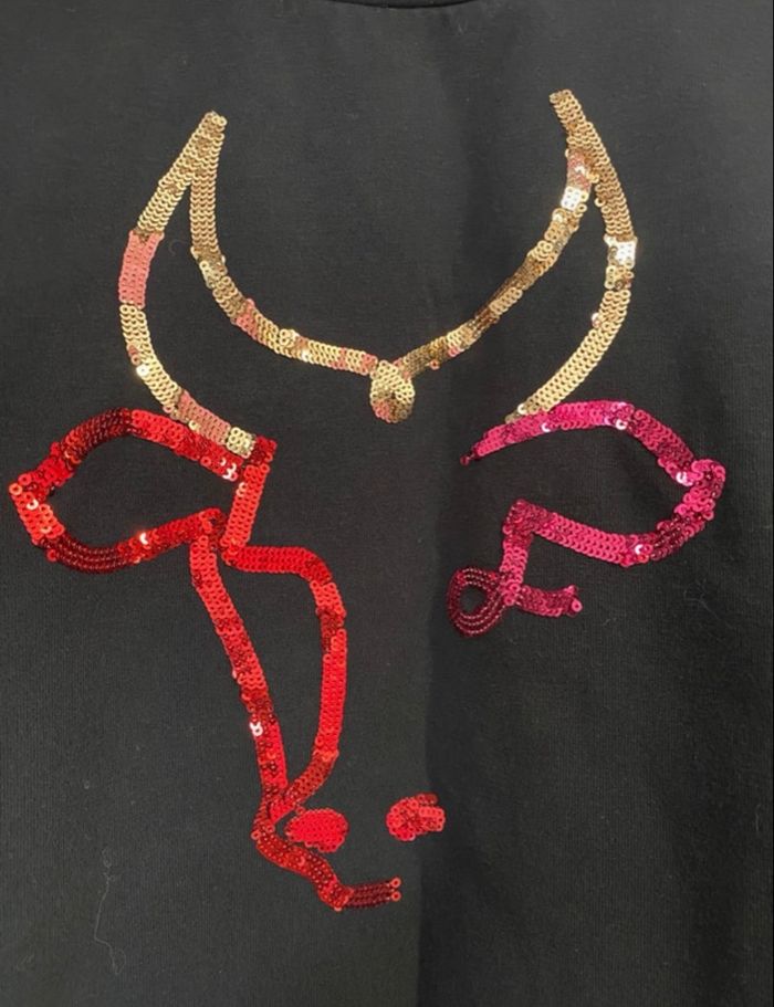 Vend un pull effet sweat matière plus fine qu'un vraie pull il n'est pas doublé Matière agréable et confortable Taureau en sequin très bon état Taille 44 plutôt 42 taille petit !!voir dernière photo le pull et tache au niveau du poignet très léger ce voit pas beaucoup!! Acheter 87€