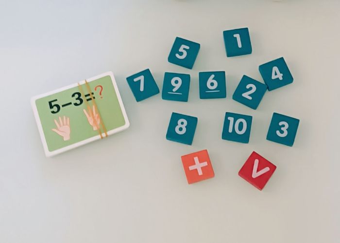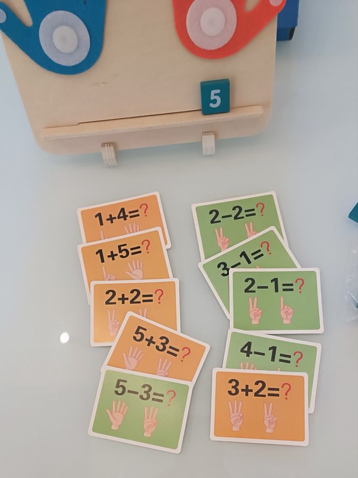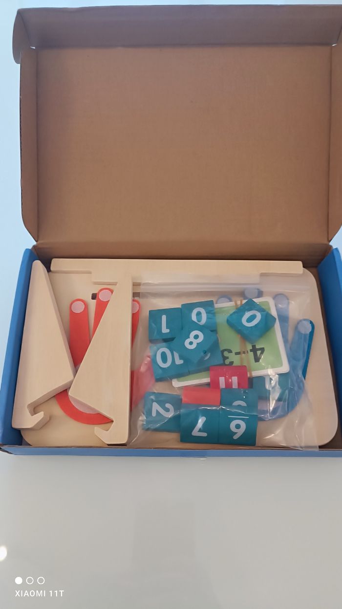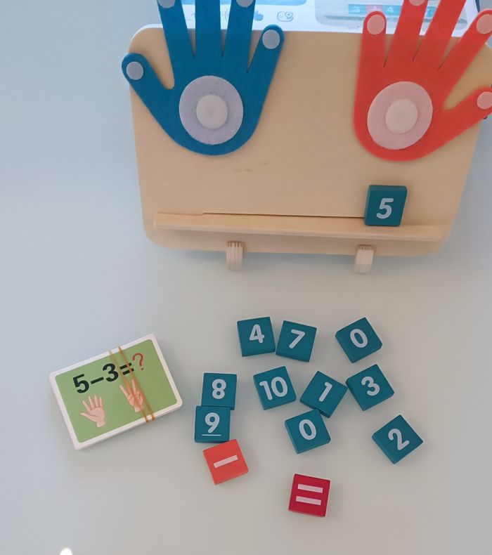 Un jeu ludique et pédagogique pour apprendre à compter, additionner et soustraire en manipulant. Grâce aux mains en feutrine et aux cartes calculs, l’enfant visualise les quantités et comprend les opérations de manière concrète et intuitive. 🎯 Objectifs pédagogiques : • Apprendre à compter jusqu’à 10 • Comprendre les additions et soustractions simples • Associer quantité et chiffre • Développer la logique mathématique • Renforcer la motricité fine et la coordination œil-main • Favoriser la mémoire visuelle et la concentration  📦 Contenu : • 1 support en bois avec 2 mains articulées • Chiffres de 0 à 10 • Symboles +, −, = et < • Cartes modèles avec opérations  🌿 Matériaux : Bois naturel et feutrine douce – 💡 Avantages : • Apprentissage par la manipulation • Visualisation concrète des calculs • Jeu évolutif selon le niveau de l’enfant • Favorise l’autonomie et la confiance   👶 Âge recommandé : Dès 3 ans Idéal pour la maternelle, l’apprentissage Montessori ou les enfants ayant besoin d’un support visuel et concret (DYS, TDAH…).  ✅ État : Jeu neuf, boîte d’origine présentant de légère imperfection 📮 Envoi rapide et soigné dans les 24h. ♻️ Emballage protégé et éco-responsable.