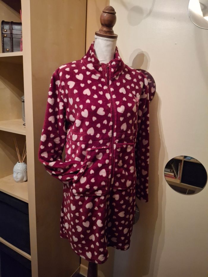 Très jolie robe de chambre, rouge bordeaux motifs coeur, taille M, toute douce en pilou pilou, très bon état.
