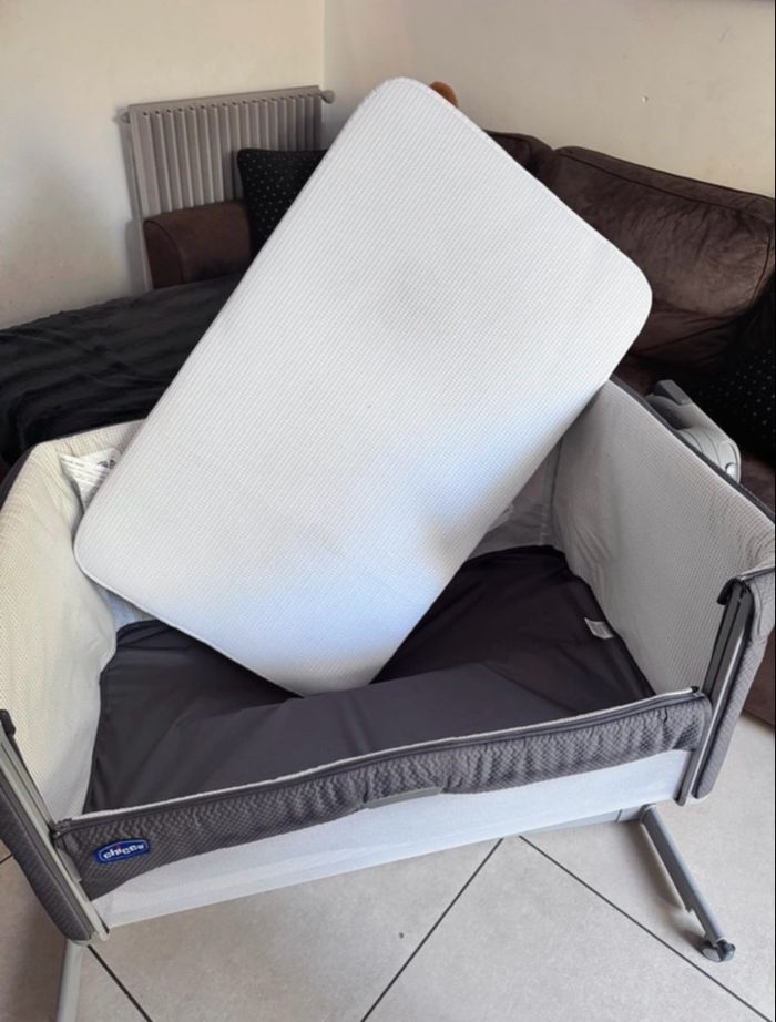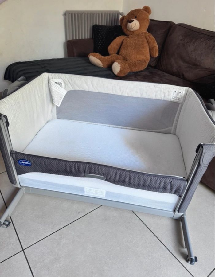 Lit cododo Chicco Next 2 Me dream Réglable en hauteur des 2 côtés pour pouvoir mettre bébé en position tête haute pour les reflux. 1 frein sur chaque roulette pour stabilisé le lit. Position balancelle ou stable. Côté coulissant pour avoir accès plus facilement à bébé et pouvoir avoir l'impression qu'il dort dans le même lit que nous. Entierment déhoussable pour le lavages. Sangle de fixation pour fixer au lit pour plus de sécurité. Matelas d'origine déhoussable en maille 3D pour laisser respirer le matelas, réduction de la transpiration. Côté latéral en maillage pour éviter tout étouffement. Compatible à plusieurs Modèle de lit, car réglable en hauteur . Grande dimension bébé peux rester dans le lit jusqu'à qu'il soit en âge de ce mettre assis / debout après ce serrais trop dangereux. Le mien et rester jusqu'à 9mois Très bon état général. Sur les photos vous constaterais une auréole car je venais de laver. Il a était entièrement désinfecté. Maison non fumeur. Boîte d’origine et housse de transport . Offert 2 housse de matelas petite étoile dimension 70×140 mais très pratique pour faire le tour