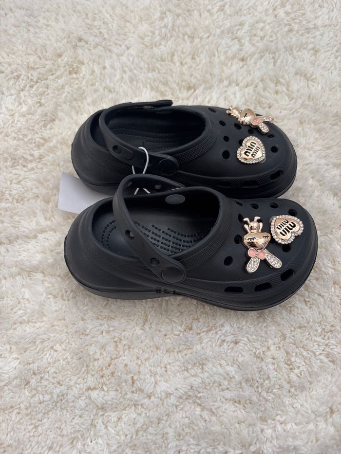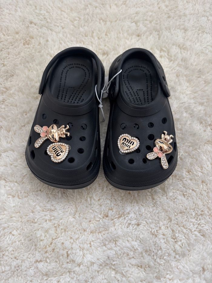 ✨ Sabots style Crocs noirs avec charms dorés – Enfant ✨ Adorables sabots noirs, confortables et légers, parfaits pour le quotidien 🌸 🔹 Couleur : Noir 🔹 Matière : Mousse légère et souple 🔹 Fermeture : Bride arrière ajustable 🔹 Détails : Jolis charms décoratifs dorés (cœur et ourson) 🔹 Semelle antidérapante 🔹 Faciles à enfiler Idéales pour la maison, l’école, les sorties ou les vacances ☀️ Confortables, pratiques et tendance 💛 *2 pins offerts 📦 Disponibles immédiate mentionné