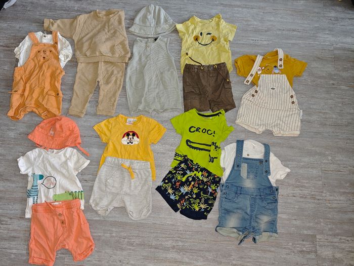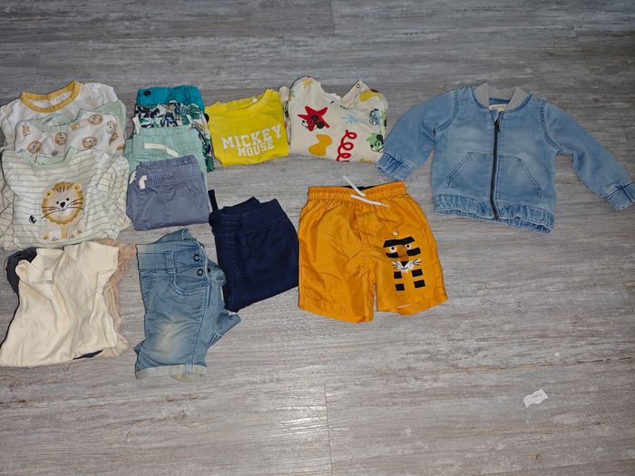 8 ensemble été avec 2 bonnets 1 ensemble hiver 3 pyjama manches longues 4 bodies 5 shorts, dont 1 short de bain 1 Jogging 1 teeshirt 1 veste en jean neuf 1 pull Mickey 1 combi 4 paires de chaussettes PS: pour plus de photos venez en PV