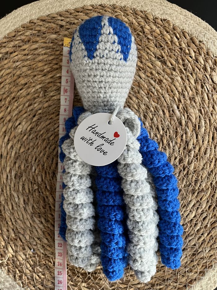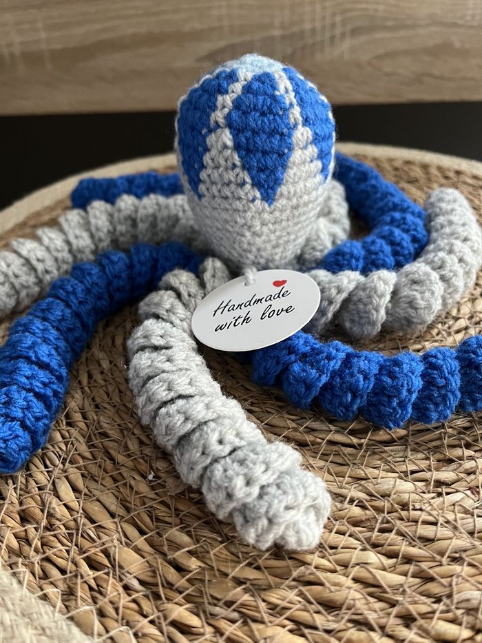 🐙 Pieuvre au crochet bleu & gris , pour prématuré et naissance Adoptez cette adorable pieuvre en crochet, entièrement faite à la main avec soin et amour. Ses tentacules spiralés et ses couleurs douces bleu et gris en font un compagnon parfait pour bébé ou une jolie décoration. Détails du produit : Fait main (amigurumi) Couleurs : bleu, gris Matière : fil doux lavable en machine à 30° Rembourrage moelleux 8 tentacules texturés Pièce unique ou petite série Idéal pour : Cadeau de naissance Doudou bébé prématuré où naissance Décoration chambre enfant Cadeau original fait main Une question , des couleurs différentes n'hésitez pas à envoyer un message une réponse vous sera donner dans la journée