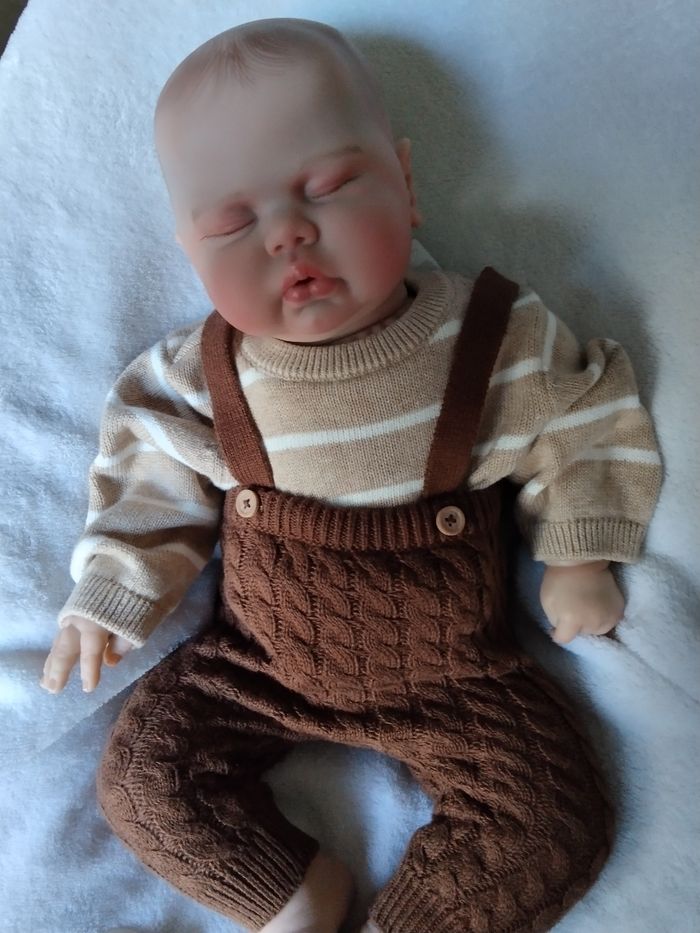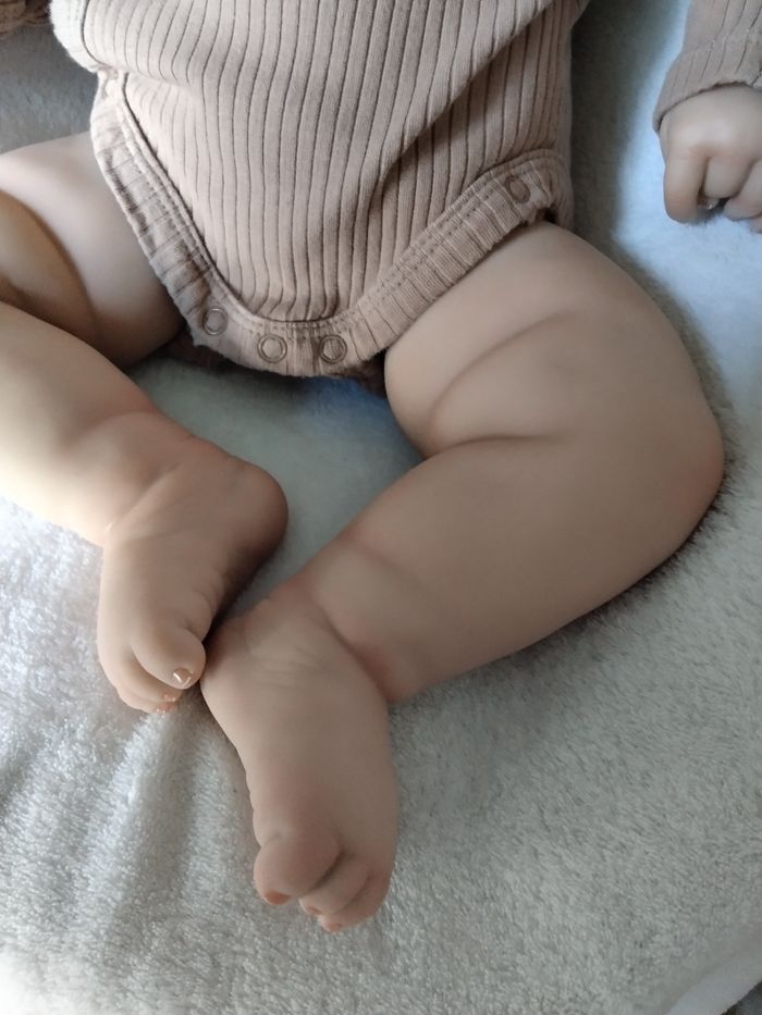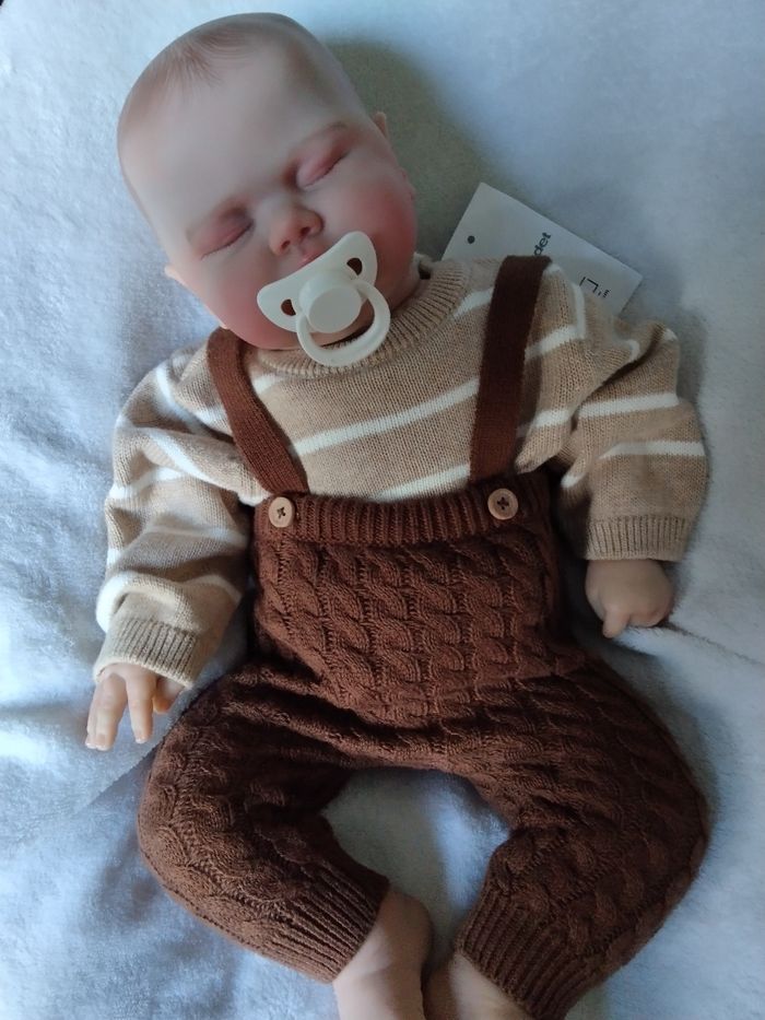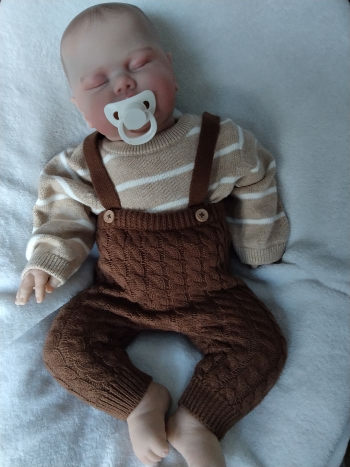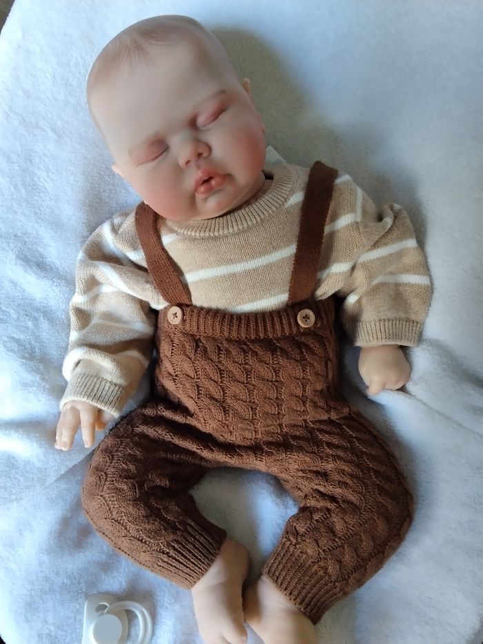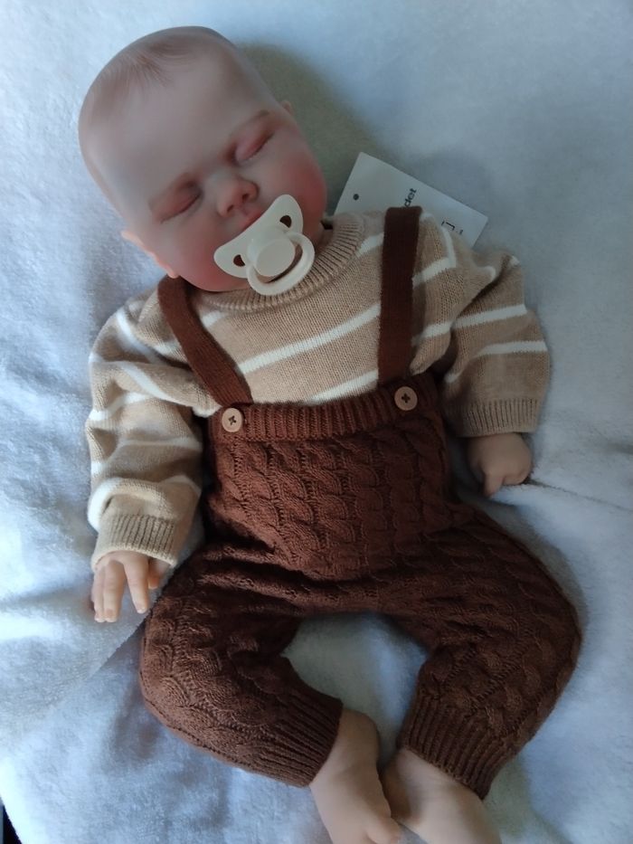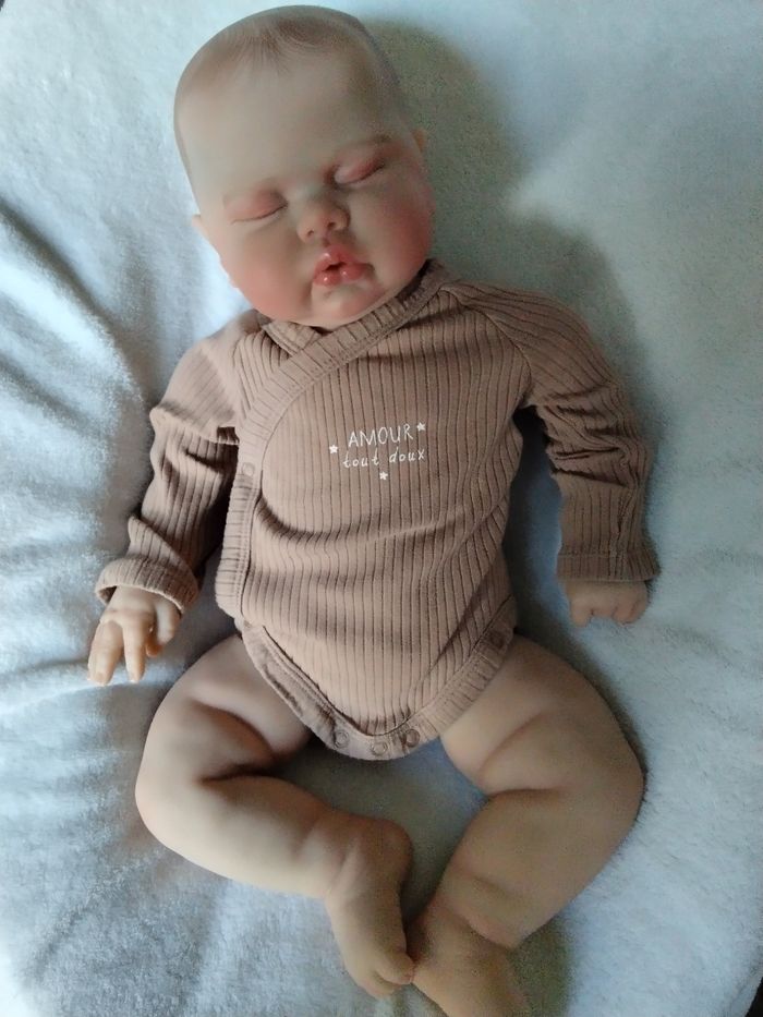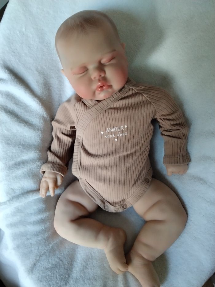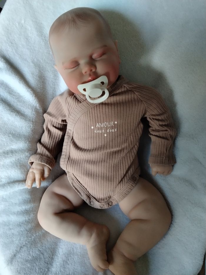 Bébé reborn de 48 cm pour 2 kilos 730 Sa tête tombe légèrement comme un vrai bébé Ses membres sont en vinyle et son corps est en tissu Sa bouche est aimantée Il s'habille en 1 mois Il partira avec son ensemble neuf, son body, sa tétine aimantée visible sur les photos ainsi que son joli trousseau