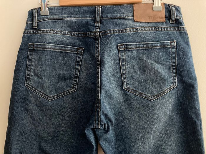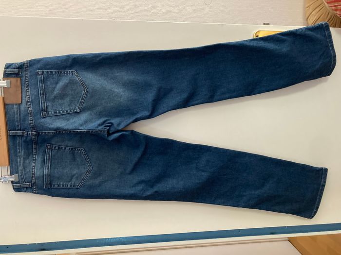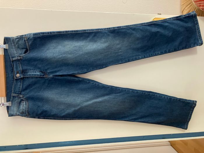 Jean Tissaia, taille 42. 98% coton, 2% elasthanne. Largeur taille 42 cm, longueur entrejambe jusqu en bas 85 cm, entrejambe jusqu’en haut 24 cm. Largeur bas de jambe 20 cm.