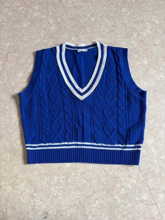 Pull sans manches de la marque Cache-Cache en taille M, couleur bleu et blanc. Porté seulement occasionnellement, donc très bon état.