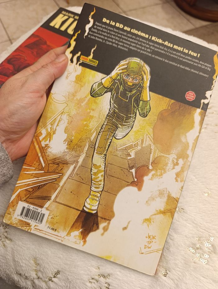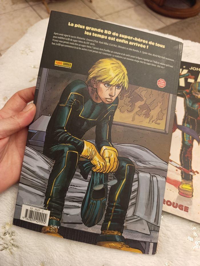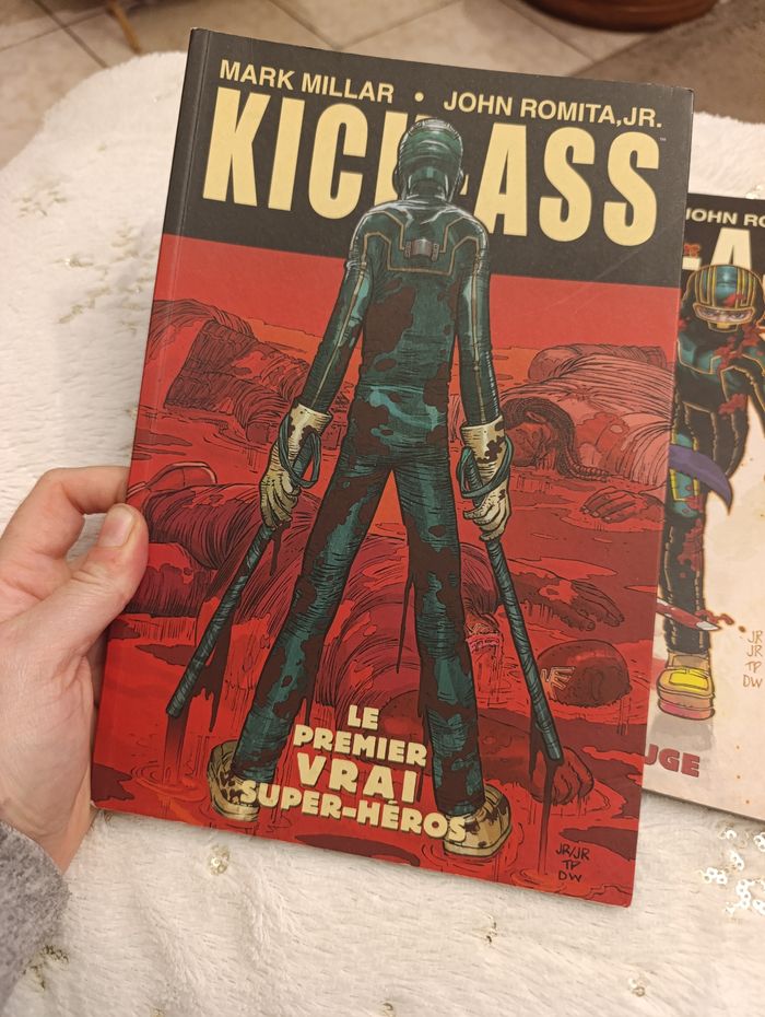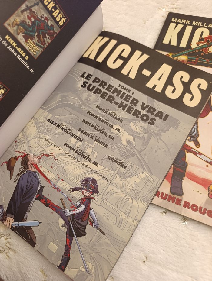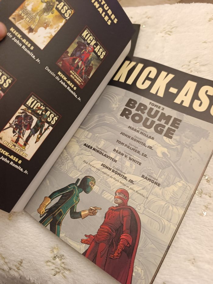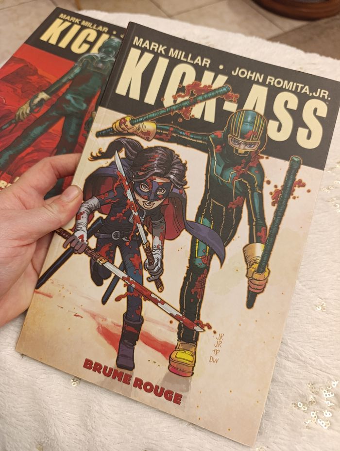 lot comprenant les deux premiers tomes de la célèbre saga Kick-Ass, écrite par Mark Millar et illustrée par John Romita Jr. Plongez dans l'univers de Dave Lizewski, un adolescent ordinaire qui décide de devenir un super-héros sans avoir le moindre pouvoir... à ses risques et périls ! Le lot contient : Tome 1 : "Le premier vrai super-héros" (Couverture rouge) – Les débuts fracassants de Kick-Ass. Tome 2 : "Brume Rouge" (Couverture blanche) – L'arrivée de nouveaux alliés et ennemis, dont la redoutable Hit-Girl.
