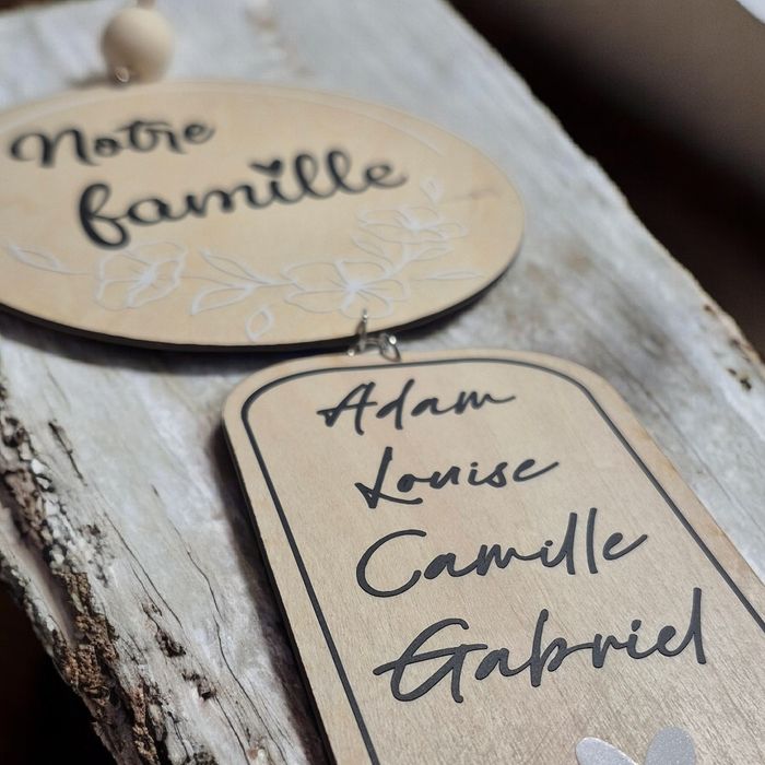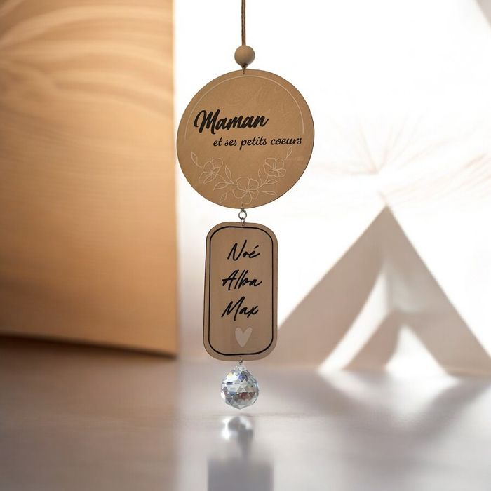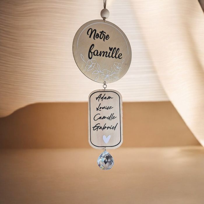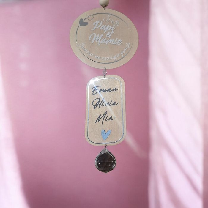 Ajoutez une touche de douceur et de lumière à votre intérieur avec cette pancarte personnalisée accompagnée d’un attrape-soleil. Un objet décoratif plein d’émotion, idéal pour célébrer la famille, l’amour et les liens précieux. Fabriquée avec soin, cette pancarte en bois est entièrement personnalisable : 👉 texte 👉 prénoms 👉 message (famille, grands-parents, enfants, couple…) Lorsque le soleil traverse le cristal, de jolis reflets lumineux viennent sublimer votre espace 🌈 💛 Détails du produit : Pancarte décorative en bois naturel Texte et prénoms personnalisables selon vos envies Attrape-soleil cristal suspendu Suspension facile (corde incluse) Style doux, naturel et intemporel 🎁 Idéal comme cadeau pour : Grands-parents (Papi, Mamie…) Cadeau de naissance Fête des mères / pères Cadeau de famille ou souvenir personnalisé Décoration de maison ou de véranda Chaque création est réalisée avec amour pour en faire un objet unique et chargé d’émotion 📩 Personnalisation : Indiquez simplement le texte et les prénoms souhaités lors de la commande.