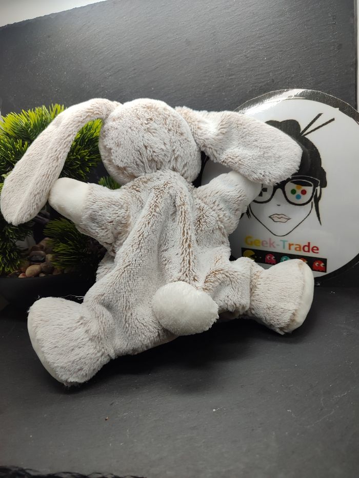 Doudou marionnette lapin blanc marron chiné Tex baby Carrefour gris Peluche Rond