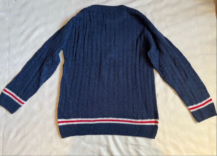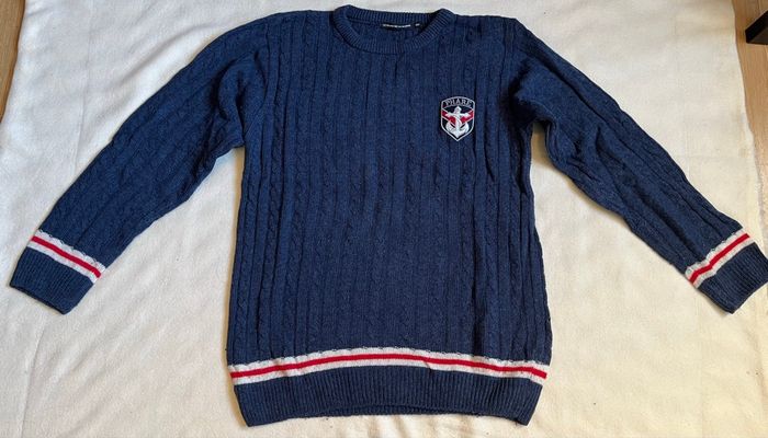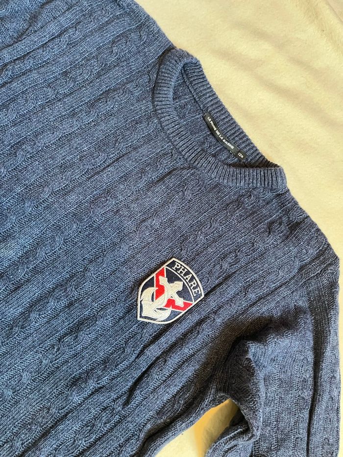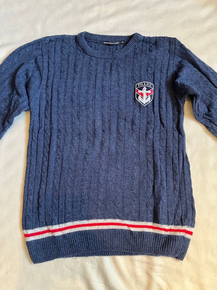 vend ce pull manches longues pour garçons matière type laine 80% laine 20% polyamide couleur bleu marine avec bande rouge et blanche sur le bout des manches Et au niveau de la taille marque le phare de la baleine taille 12 ans demi largeur aux aisselles 44 cm longueur 61 cm 10 euros Mes autres annonces de vêtement pour garçons de 10 à 12 ans #lma42garcon10 #lma42garcon11 #lma42garcon12