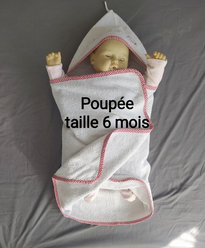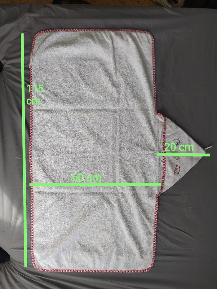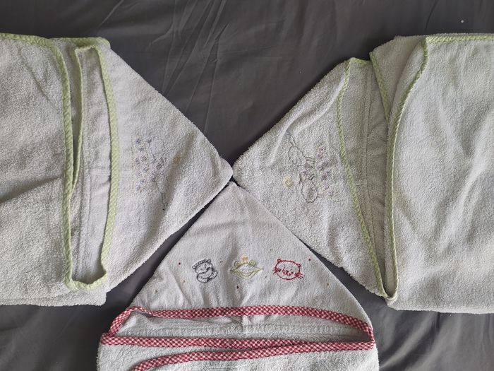 Lot de 3 Serviettes Bébé rectangulaires et 1 gant avec capuche triangle, 20 cm dimensions: 115x60 cm, marque: Ikéa, en 100% coton éponge, dès la naissance (là exemple avec une poussée correspondant à un BB de 6 mois, bien enveloppé et y a encore un peu de longueur au niveau des pieds) 3 blanches motifs brodés, 1 gant blanc, marque: Maison Bastide Bon état peu avoir des traces propres et accros sur le tissus éponge