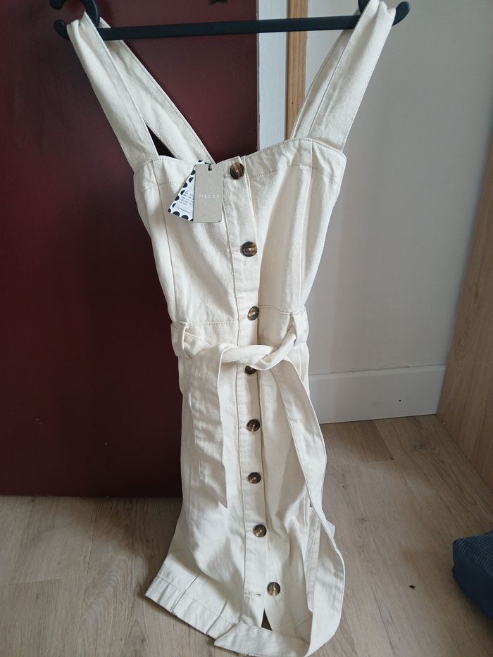 Belle robe boutonnée mais beaucoup trop grande Et trop longue pour moi Conviendrait à une personne de plus 1.65 et avec une poitrince assez importante pour éviter que ça baille devant.