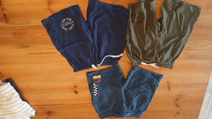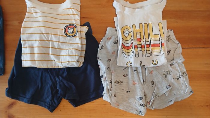 A vendre lot de vetements garcon 4 ans 2 pantalons 2 tee shirts manches longues 1 tee shirt 1 pantalon de survetement 2 pyjashorts 3 shorts legers 1 kway dinosaure