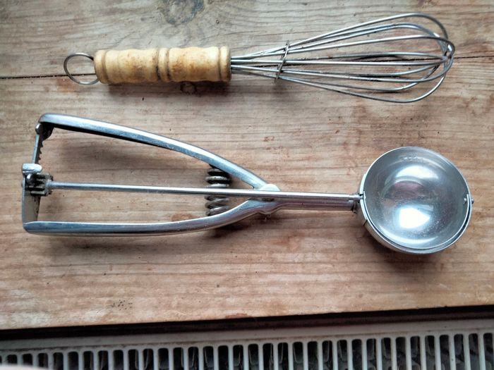 Le fouet est un peu rouillé mais c'est pas méchant. La cuillère à glace est nickel. Je les donne donc si quelque chose d'autre vous intéresse dans mon dressing, faites un lot et je vous déduirais les 1€