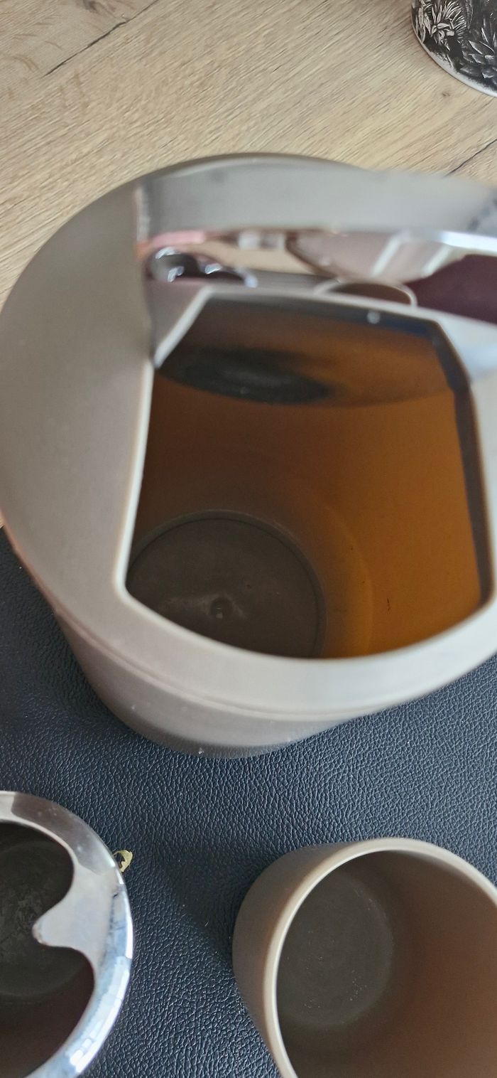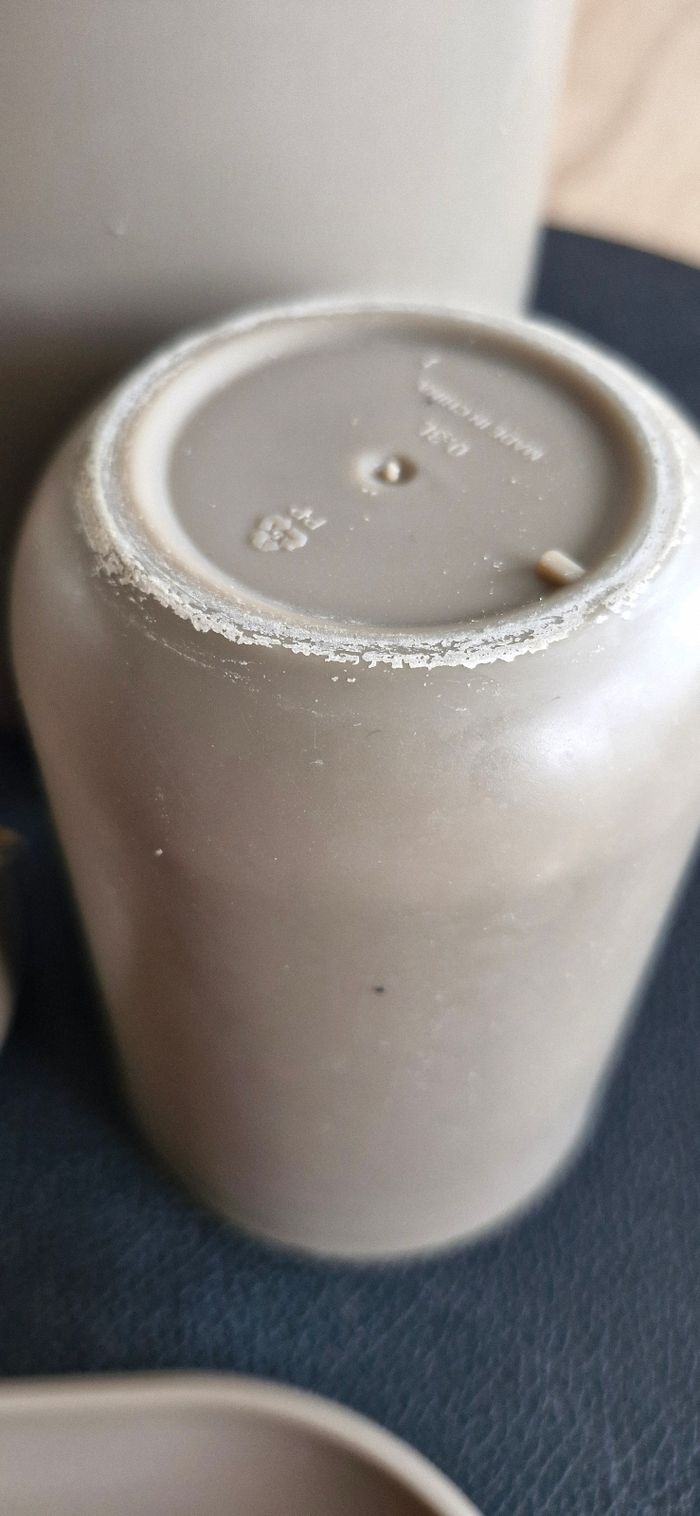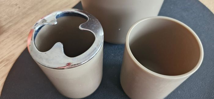 Ensemble salle de bain en plastique beige 1 verre à dent 1 poubelle 1 support brosse à dent 1 porte savon Bon état général quelques traces d'usure