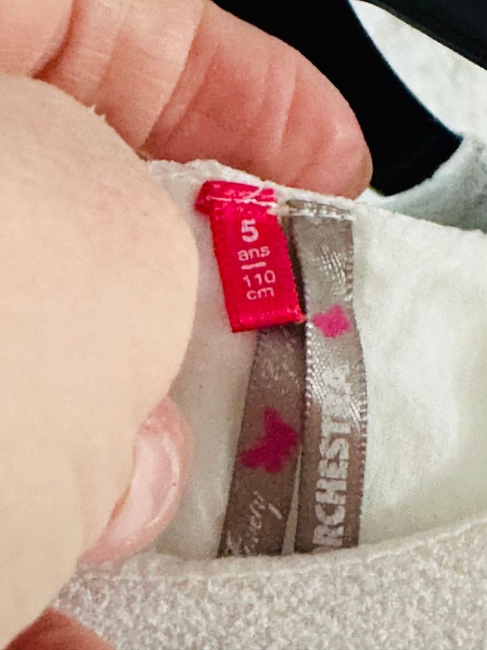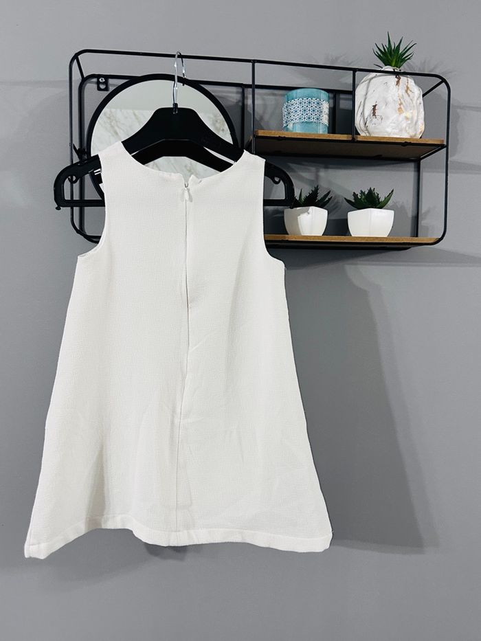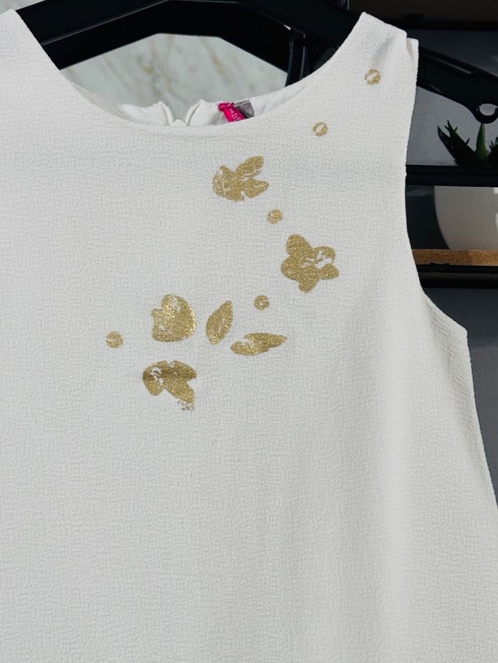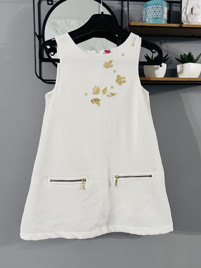 ravissante robe sans manches blanche pour enfant, parfaite pour une occasion spéciale ou une tenue de cérémonie élégante. • Couleur : Blanc cassé . • Détails : Motifs délicats de papillons et feuilles dorés sur la poitrine. • Deux fausses poches avec fermetures éclair dorées sur le bas pour une touche moderne. • Matière : Tissu texturé de type piqué/gaufré, assez épais et de bonne tenue. • État : Très bon état • Taille : 6 ans / 110 cm