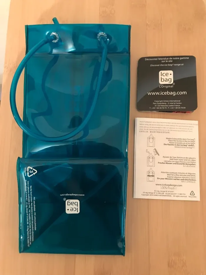 Sac à glaçons ICEBAG Neuf. Le sac à glaçon permet de réduire la température d'une bouteille de 20°C à 11°C en 15 à 20 minutes , ce qui prend environ 3 heures au réfrigerateur.