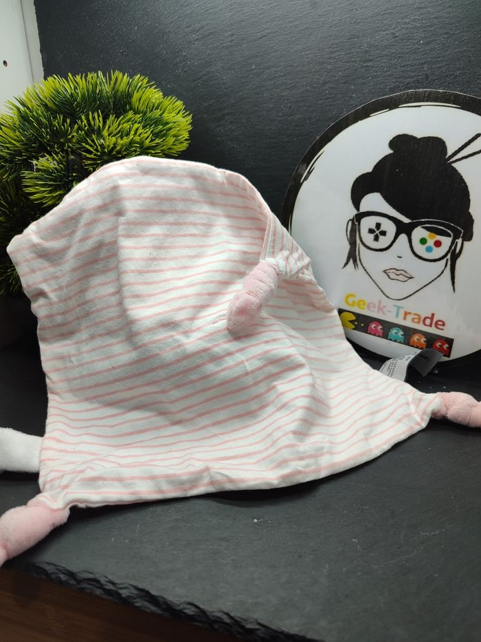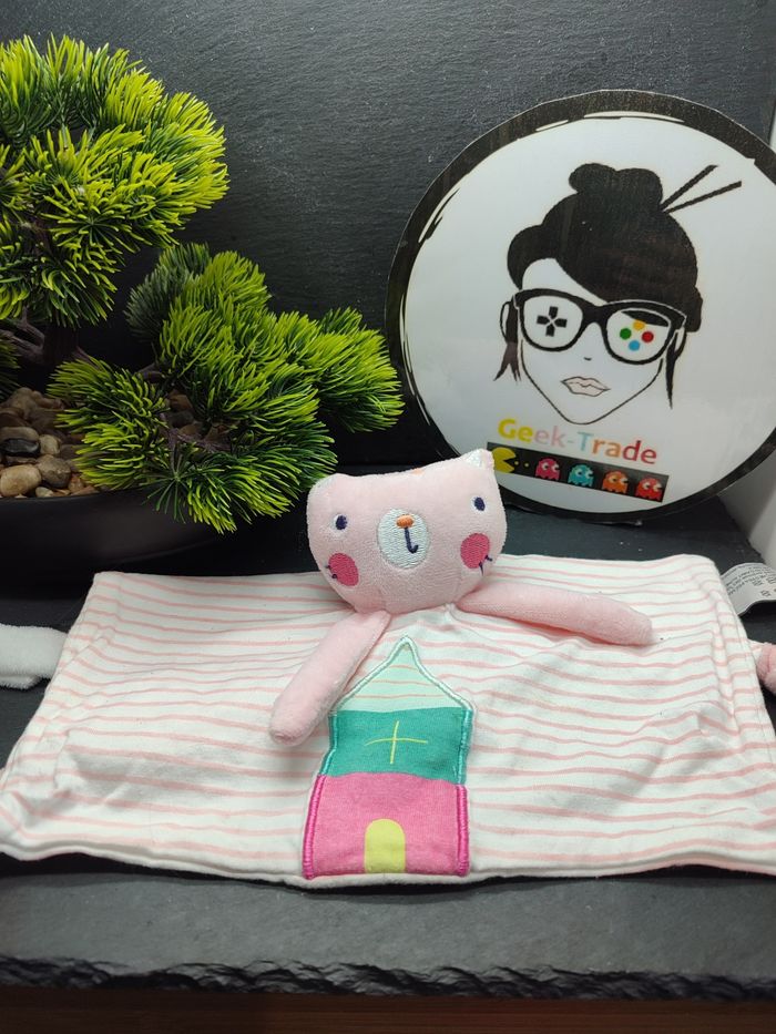 Doudou Chat Plat Rose Rayé maison blanc queue noeud orchestra Prémaman 2375 - photo numéro 1