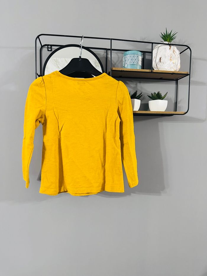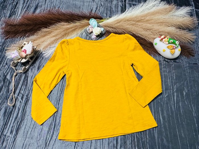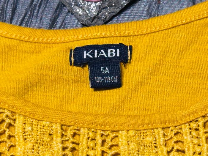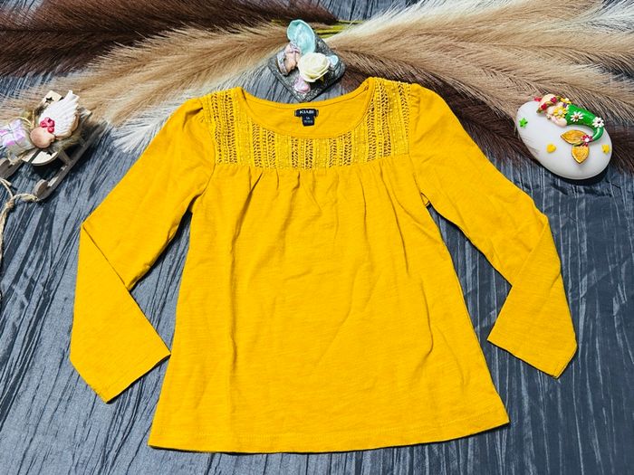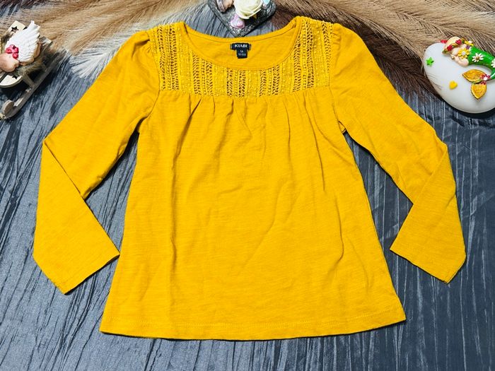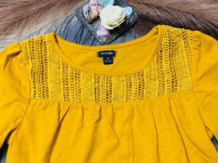 joli haut à manches longues de la marque Kiabi. • Couleur : Jaune moutarde (parfait pour toutes les saisons !). • Détails : Magnifique empiècement en broderie/dentelle au niveau du col et du buste. Légères fronces pour un bel effet fluide. • Taille : 5 ans • État : Très bon état, peu porté. Pas de taches ni de trous.