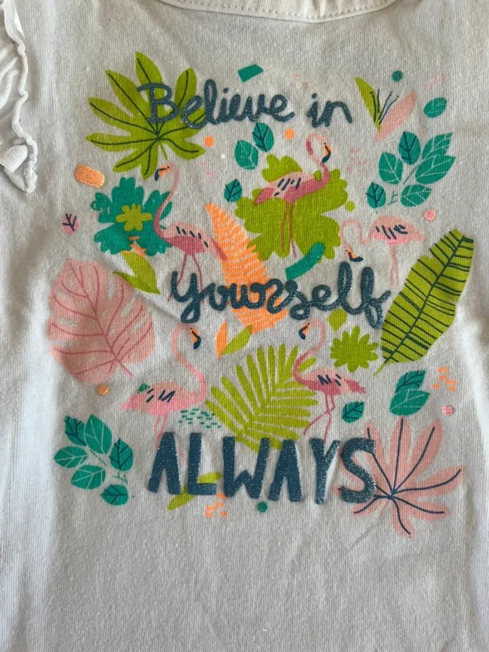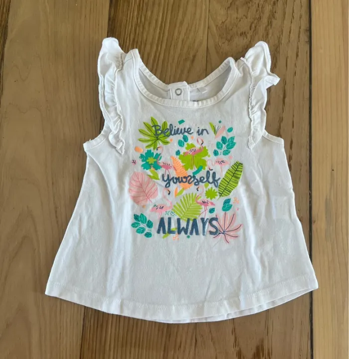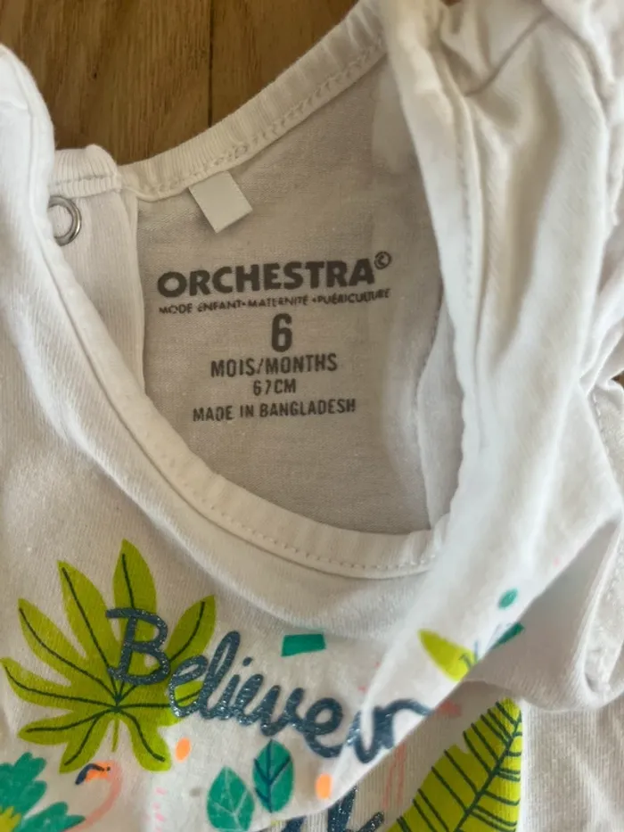 Blanc – Très bon état Motif tropical, parfait pour l’été. 🌿 Maison non fumeur. ➡️ Envoi rapide et soigné. 💶 Prix négociable dans la limite du raisonnable #6moisfille #teeshirt #orchestra #6moisfilledressingombelinedim