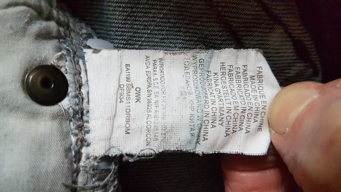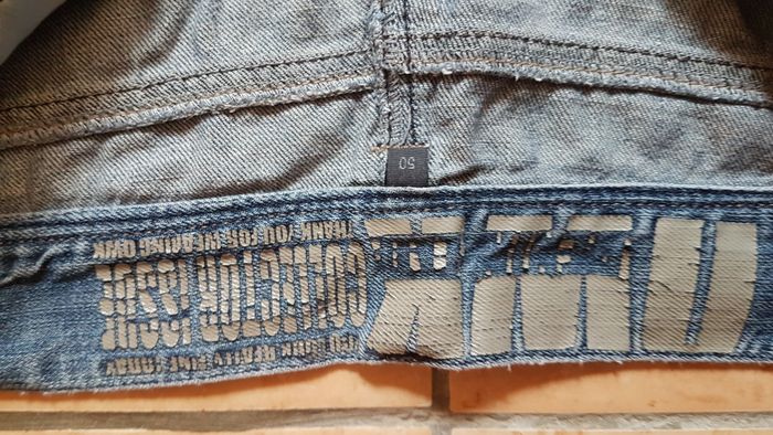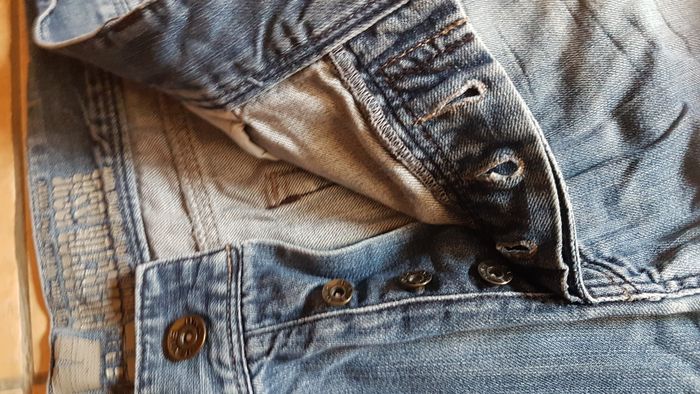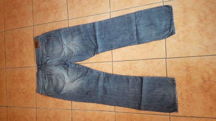 Jeans homme Taille 50 Couleur bleu 2 poches avant (marque d'usure sur le haut des poches) 2 poches arrière Fermeture à boutons Jeans droit Marque OWK