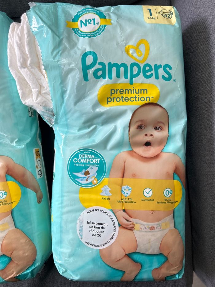 Vends 2 paquets de couches taille 1 (2-5kg) 1 des deux paquets est ouvert mais il ne manque pas de couches à été ouvert en tombant