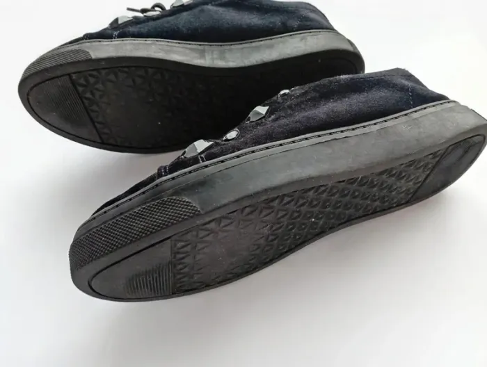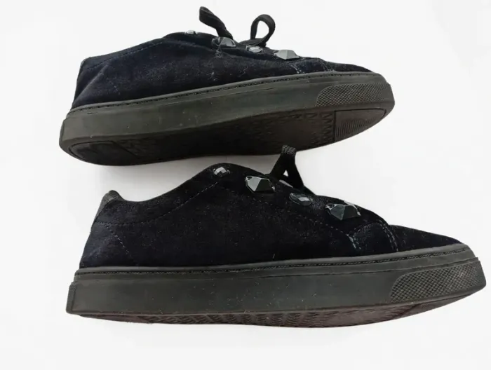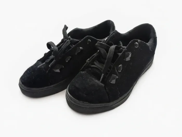 Je vends une paire de baskets noires élégantes, effet velours, avec détails décoratifs sur les côtés. Chaussures confortables, idéales pour un usage quotidien ou pour compléter une tenue habillée/décontractée. ✔ Taille : 37 ✔ Couleur : Noir ✔ Fermeture : Lacets ✔ Bon état général ✔ Semelles en bon état Merry scott