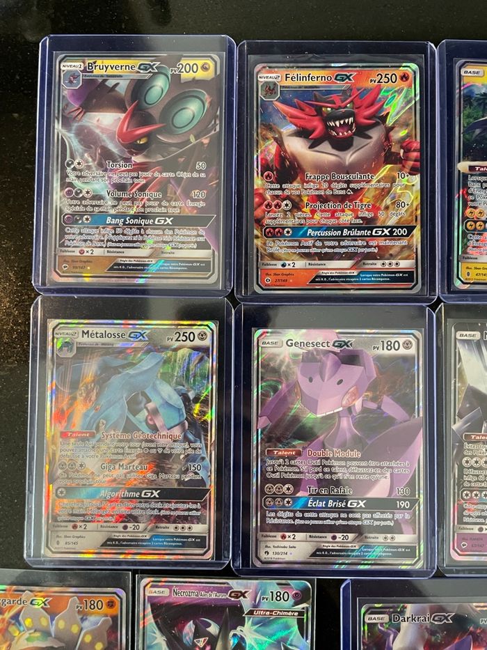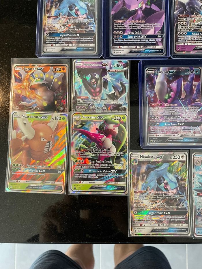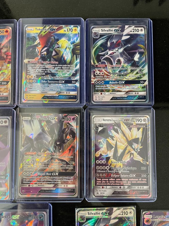 Gros lot de 18 carte et promo pokemon GX soleil & lune Les cartes sous top vont de excellent a near mint et celle sous sleeve vont de played pour les 3 en bas a droite a verry good pour le reste. - Darkrai gx 88a/147 Promos - Promos Alternative - Bruyverne gx 99/147 Soleil et Lune - Ombres Ardentes - Metalosse gx 85/145 Soleil et Lune - Gardiens Ascendants - Felinferno gx 27/149 Soleil et Lune - Soleil et Lune - Tokorico gx 47/145 Soleil et Lune - Gardiens Ascendants - Genesect gx 130/214 Soleil et Lune - Tonnerre Perdu - Silvallie gx 116/156 Soleil et Lune - Ultra Prisme - Necrozma gx 63/147 Soleil et Lune - Ombres Ardentes - Necrozma criniere du couchant sm102 Promos - Promos Soleil et Lune - Sablaireau d'alola gx sm236 Promos - Promos Soleil et Lune - Sucreine gx sm56 Promos - Promos Soleil et Lune - Necrozma ailes de l'aurore gx 63/156 Soleil et Lune - Ultra Prisme - Scarabrute gx 6/68 Soleil et Lune - Destinees Occultes - Zygarde gx sm122 Promos - Promos Soleil et Lune - Silvallie gx 90/111 Soleil et Lune - Invasion Carmin - Lunala gx sm17 Promos - Promos Soleil et Lune
