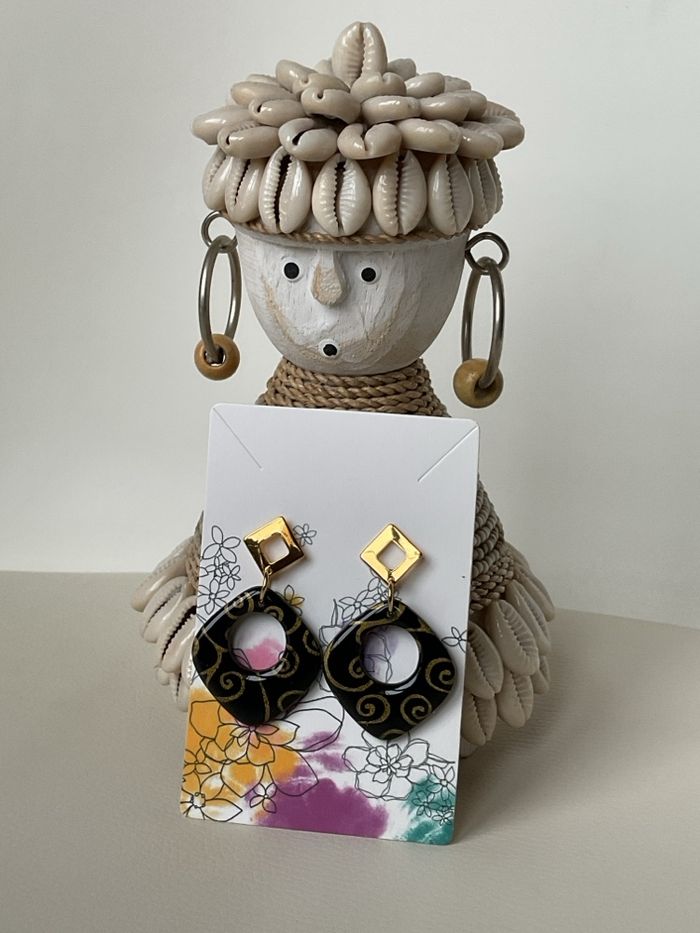 Boucles d’oreilles en pâte polymère Attaches en acier inoxydable Hauteur totale de la boucle d’oreille : 4,3 cm environ Légère et agréable à porter Résine sur l ensemble de la B.O. Pour plus de renseignements, n’hésitez pas à me contacter.
