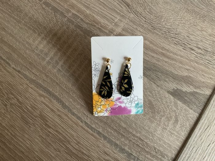 Boucles d’oreilles en pâte polymère Attaches en acier inoxydable Hauteur totale de la boucle d’oreille : 4,3 cm environ Légère et agréable à porter Résine sur l ensemble de la B.O. Pour plus de renseignements, n’hésitez pas à me contacter.