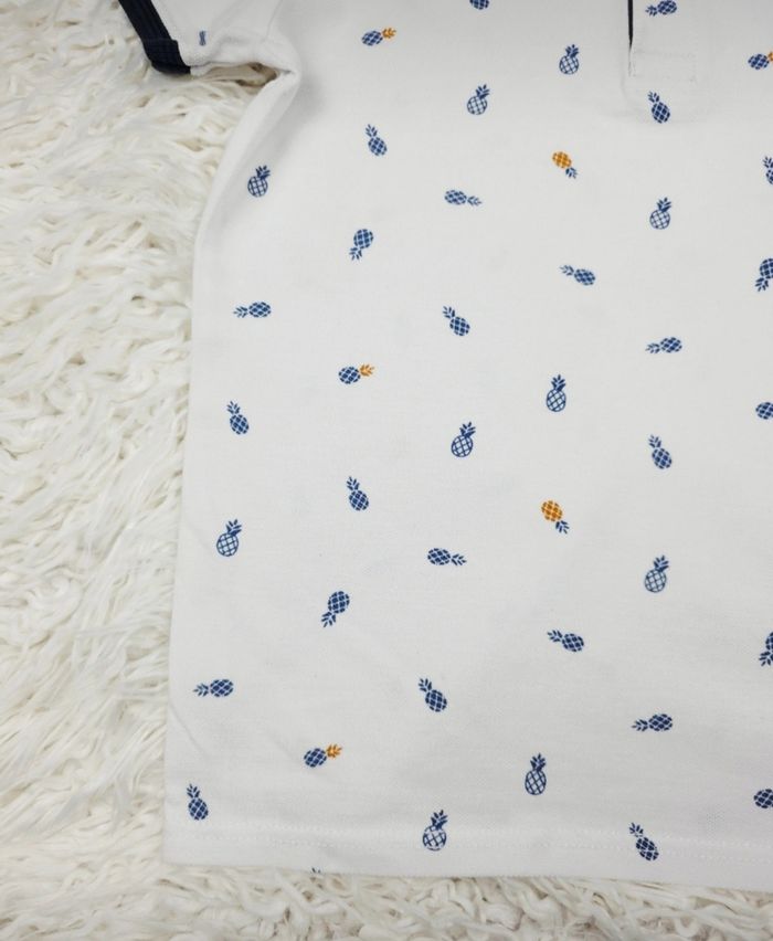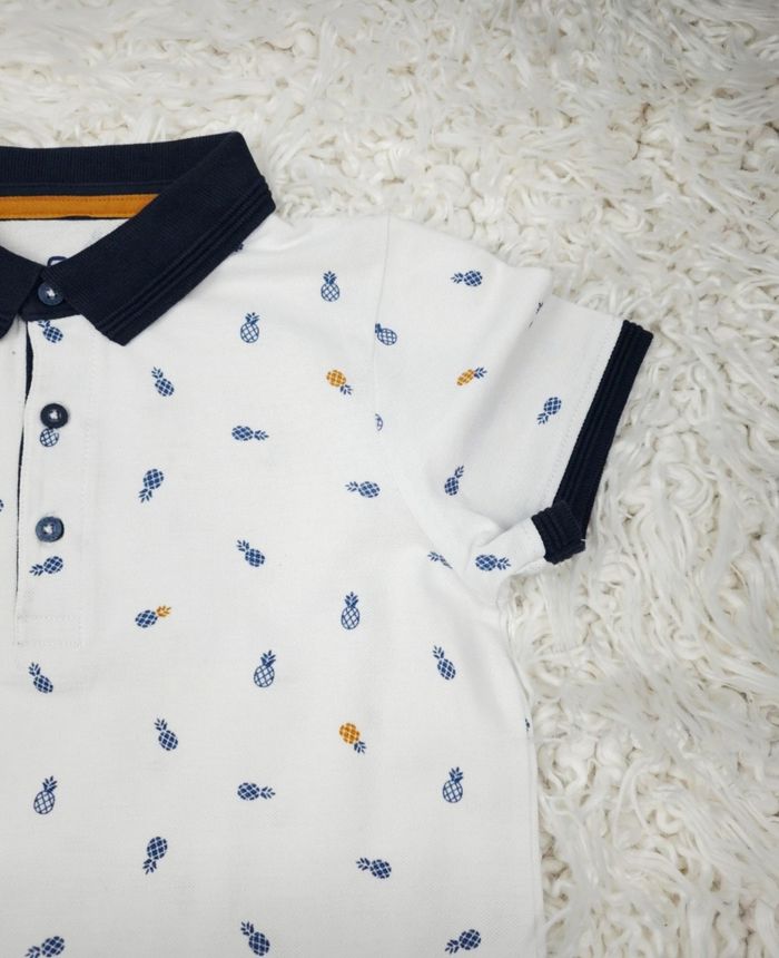 Polo en piqué de coton blanc à motifs ananas Garcon taille 8 ans marque Okaidi ✴️ Manches courtes ✴️ Couleur => Blanc avec un motif intégral d ananas de couleur bleu marine et orange ✴️ Tissu en piqué de coton ✴️ Patte de boutonnage à trois boutons ✴️ Six points de tâches (photo 3 ) ✴️ Composition -> 100 % coton