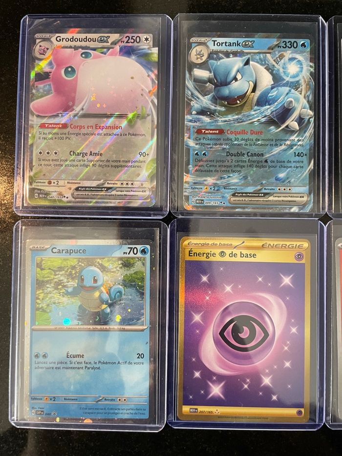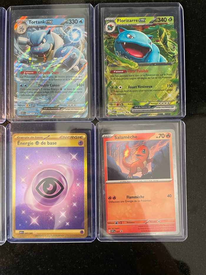 Lot de 6 carte de la série mythique 151 Toutes en excellent etat sous sleeve et toplaoder - Energie de base gold 207/165 - promo holo cosmos salameche et carapuce svp 047 et svp 048 - Grodoudou ex 040/165 - Florizarre ex 003/165 - Tortank ex 009/165