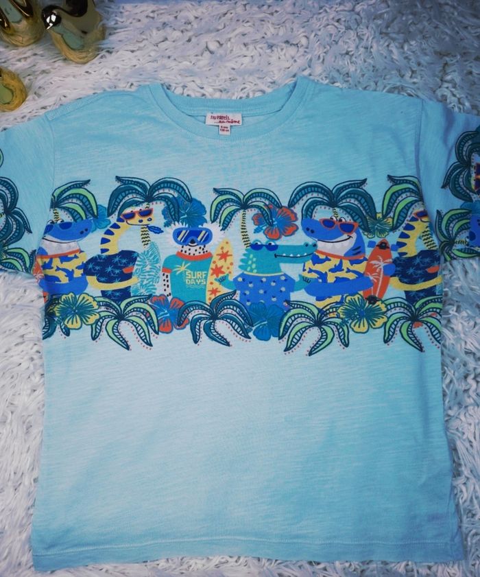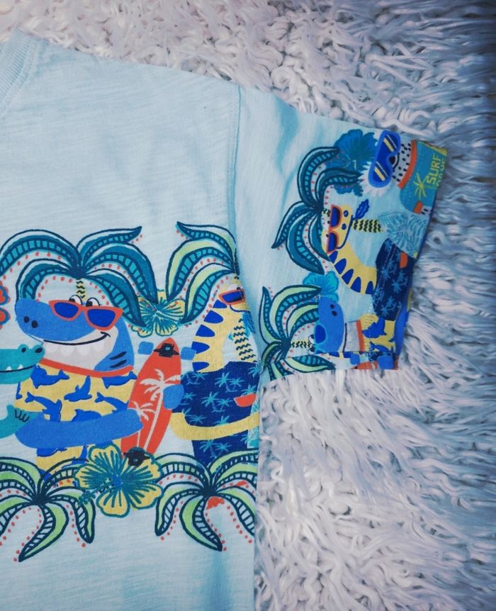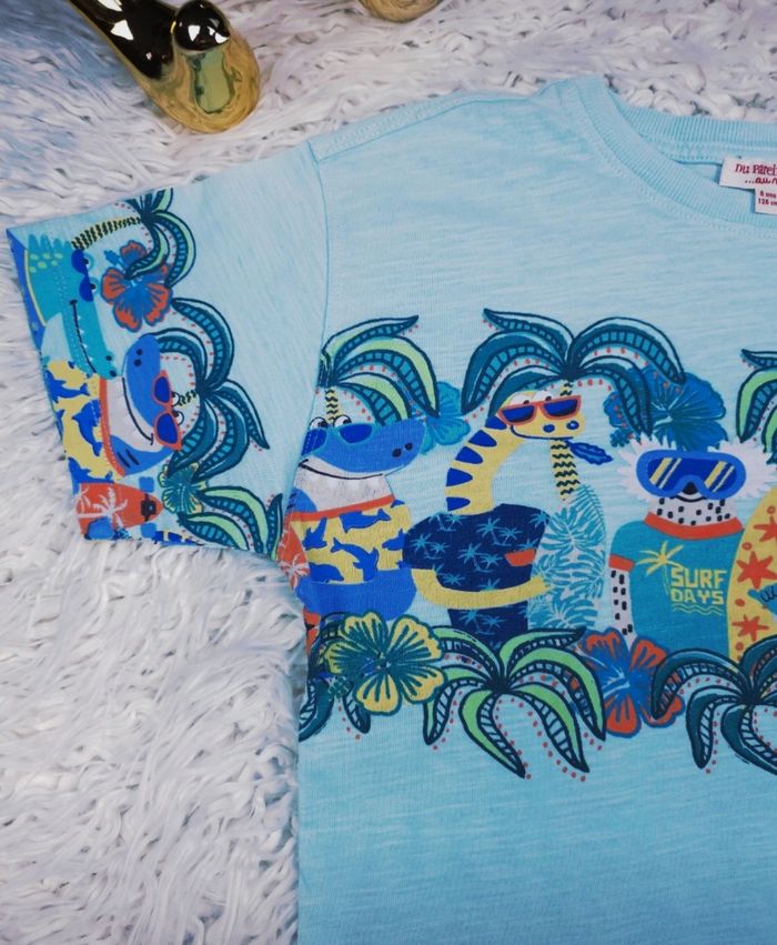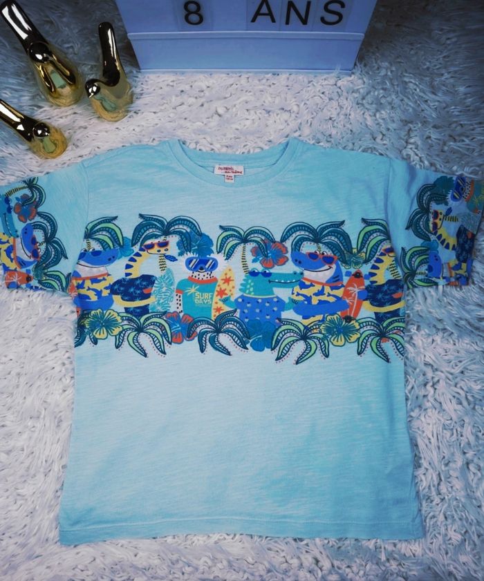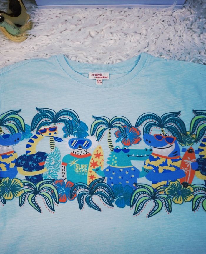 T-shirt manches courtes dinosaures surfeurs garçon taille 8 ans marque DPAM ✴️ Manches courtes ✴️ Composition => 100 % coton ✴️ Col rond ✴️ Couleur => Bleu clair ✴️ Motifs => Une large bande sur la poitrine et sur les manches présente un motif très détaillé et amusant. On y voit des dinosaures déquisés en surfeurs, entourés de palmiers et de motifs tropicaux de couleurs vives jaune, bleu, orange, vert