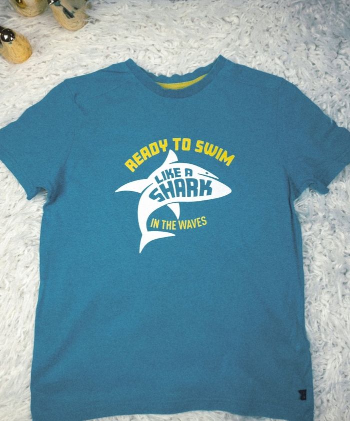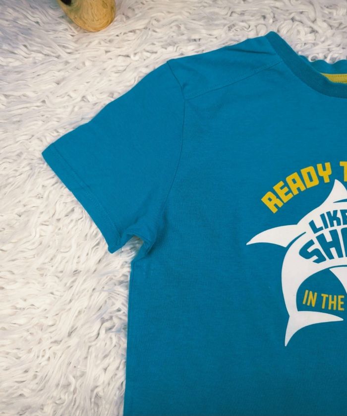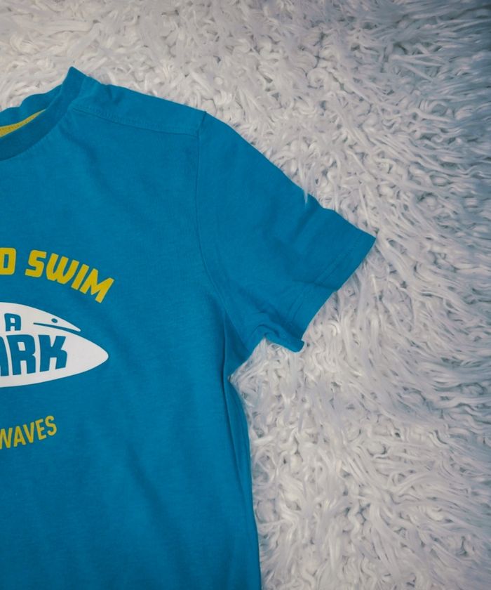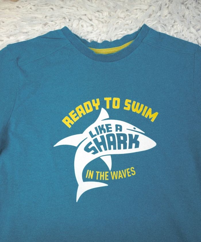 T-shirt manches courtes vert bleu shark Garçon taille 8 ans marque Okaidi ✴️ Col rond ✴️ Composition => 100 % coton ✴️ Couleur => Vert Bleu ✴️ Motifs => Un grand imprimé central en blanc et jaune. Il représente un requin stylisé avec 'inscription "Ready to swim like a shark in the waves " (Prêt à nager comme un requin dans les vagues).