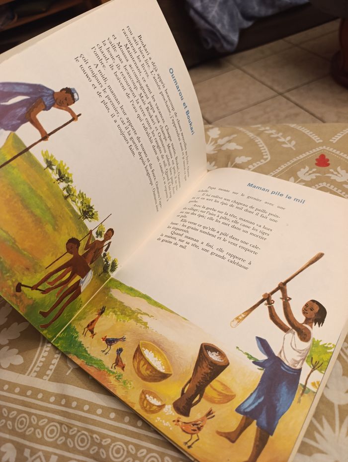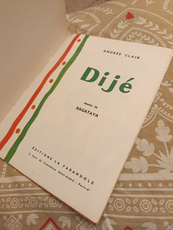 livre de contes/récit pour enfants intitulé "Dijé", écrit par Andrée Clair et illustré par Ragataya. Une œuvre classique qui plonge le lecteur dans la vie quotidienne et la culture africaine avec beaucoup de poésie. Détails du produit : Auteur : Andrée Clair (reconnue pour ses ouvrages sur l'Afrique comme "Bemba"). Illustrations : Magnifiques dessins de Ragataya, typiques du style de l'époque. Thématique : Littérature africaine, enfance, ethnologie douce.