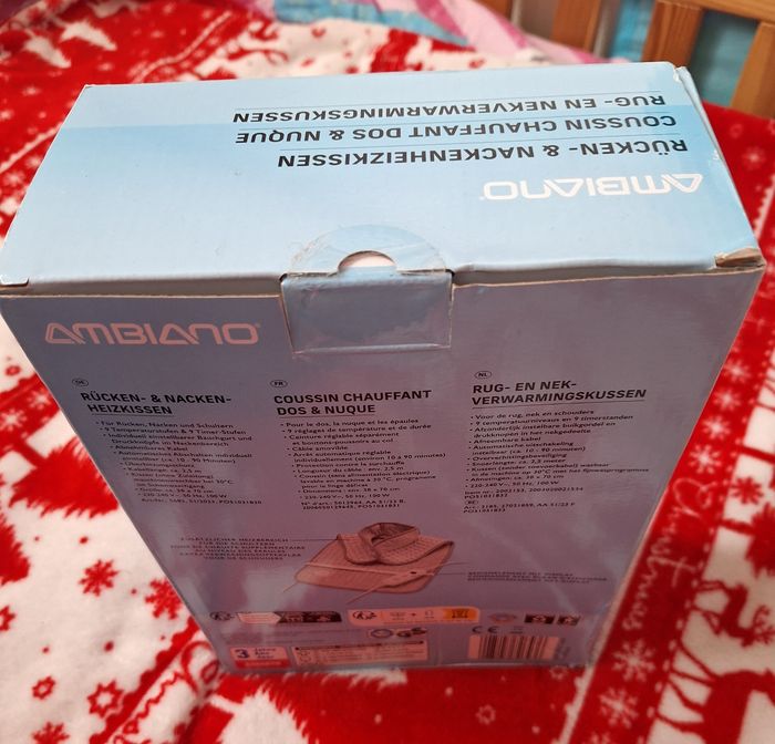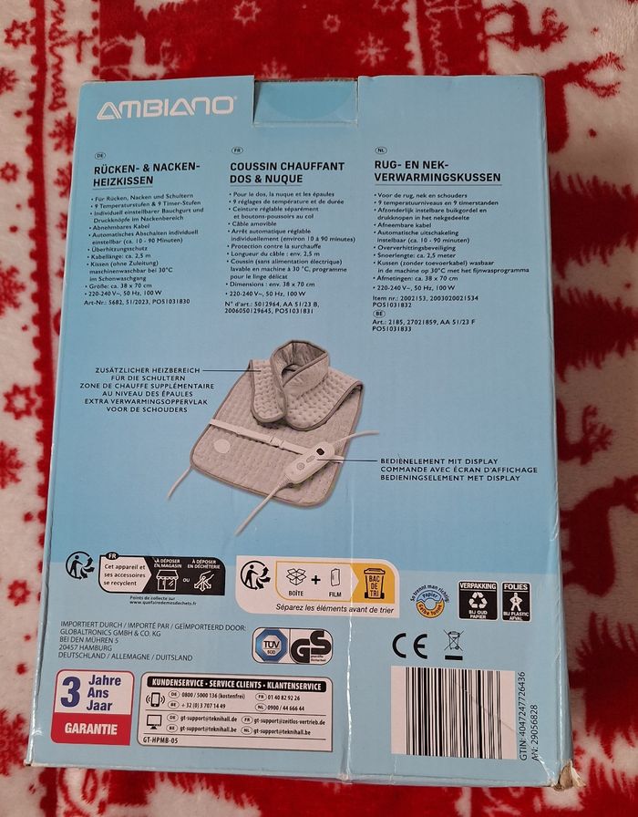 Coussin chauffant dos et nuque Pour le dos la nuque et les épaules 9 réglages de température et de durée Ceinture réglable séparément et boutons poussoir au col Arrêt automatique réglable de 10 à 90 minutes Protection contre la surchauffe Câble amovible : ~2.5 m