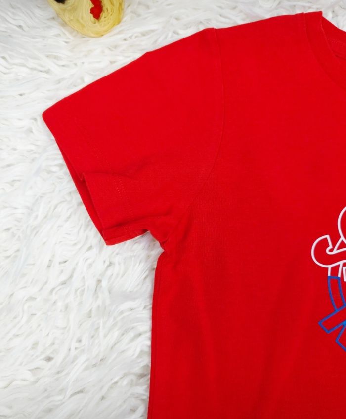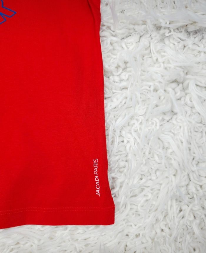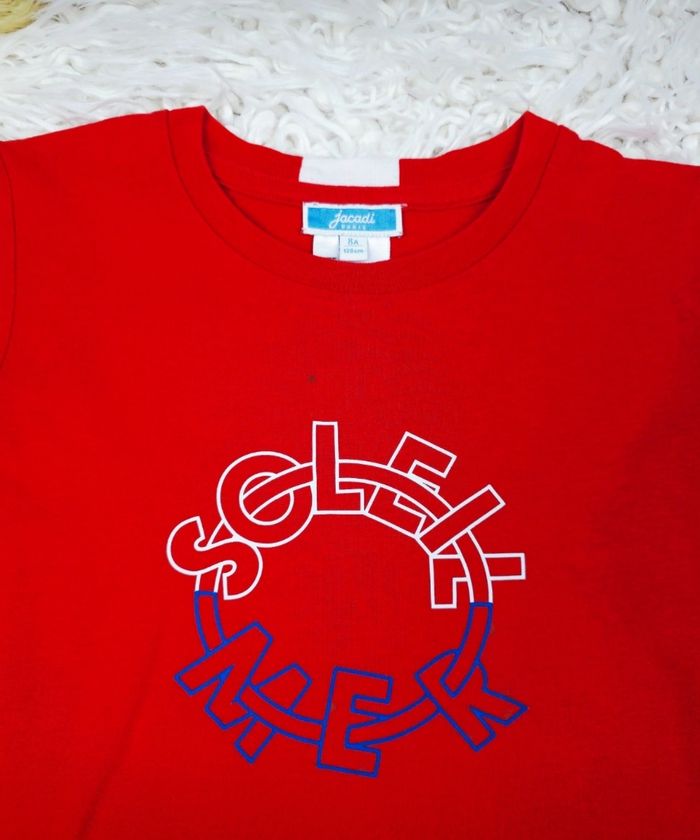 T-shirt manches courtes rouge imprimé " Soleil et Mer " Garçon taille 8 ans marque Jacadi ✴️ Manches courtes ✴️ Composition => 100 % coton ✴️ Couleur => Rouge vif lumineux avec inscription " Soleil " en blanc et " Mer " en bleu Col rond ✴️ Défaut -> Un point de tâche au dessus du " L " ( photo 2/ 3 et 6)