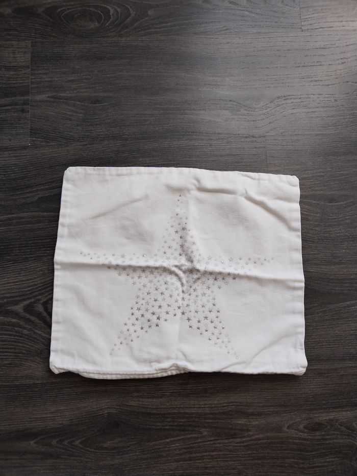 Belle housse de coussin blanche avec motif étoile en petites étoiles argentées. 40x40. Fermeture zippée. Bon état Marque : Fly