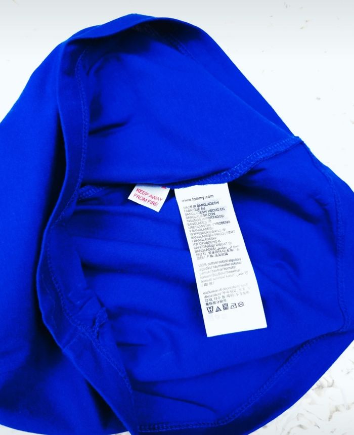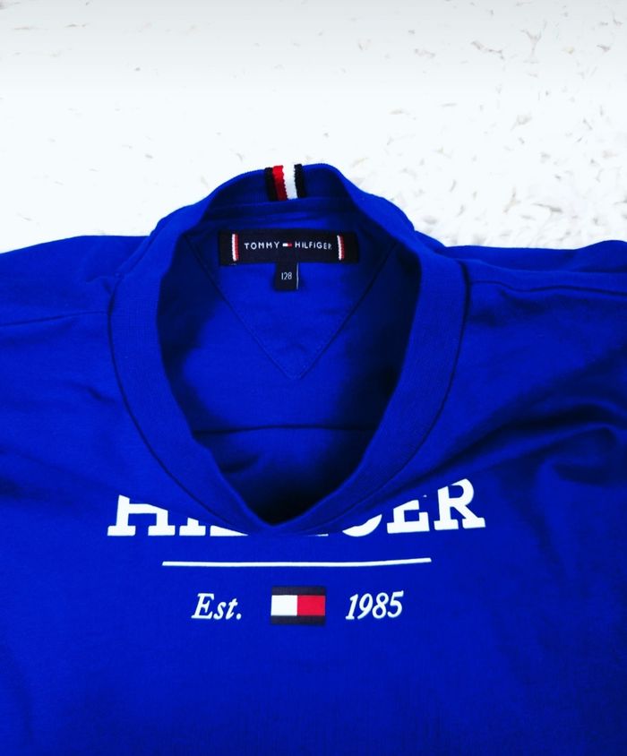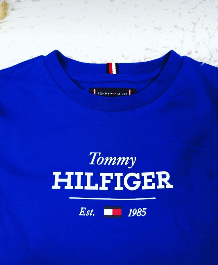 T-shirt manches courtes bleu Garcon taille 8 ans marque Tommy Hilfiger ✴️ Col rond ✴️ Composition => 100 % coton ✴️ Couleur = Bleu ✴️ Motifs => Le logo emblématique de la marque est imprimé en blanc au centre du T-shirt, aved le nom "Tommy Hilfiger" dans deux polices différentes. En dessous, on trouve l'inscription "Est. 1985" encadrant le drapeau iconique de Tommy Hilfiger ✴️ Col orné de la bande tricolore Drapeau tricolore brodé sur la manche gauche