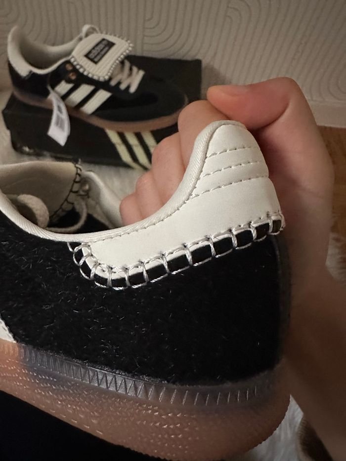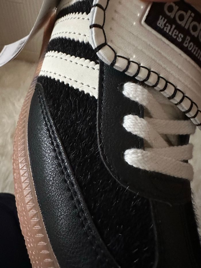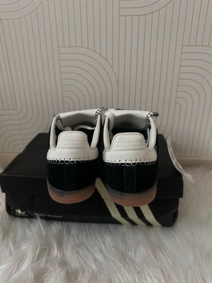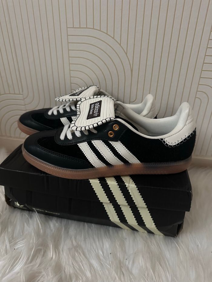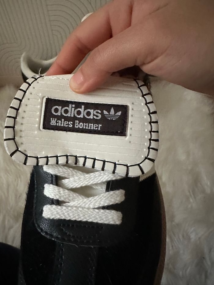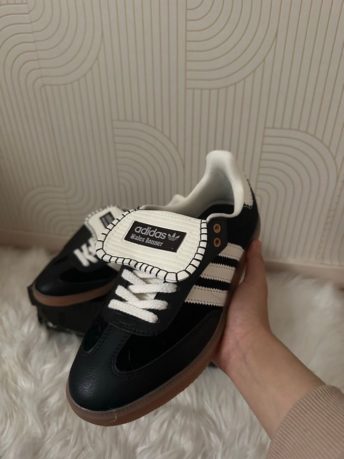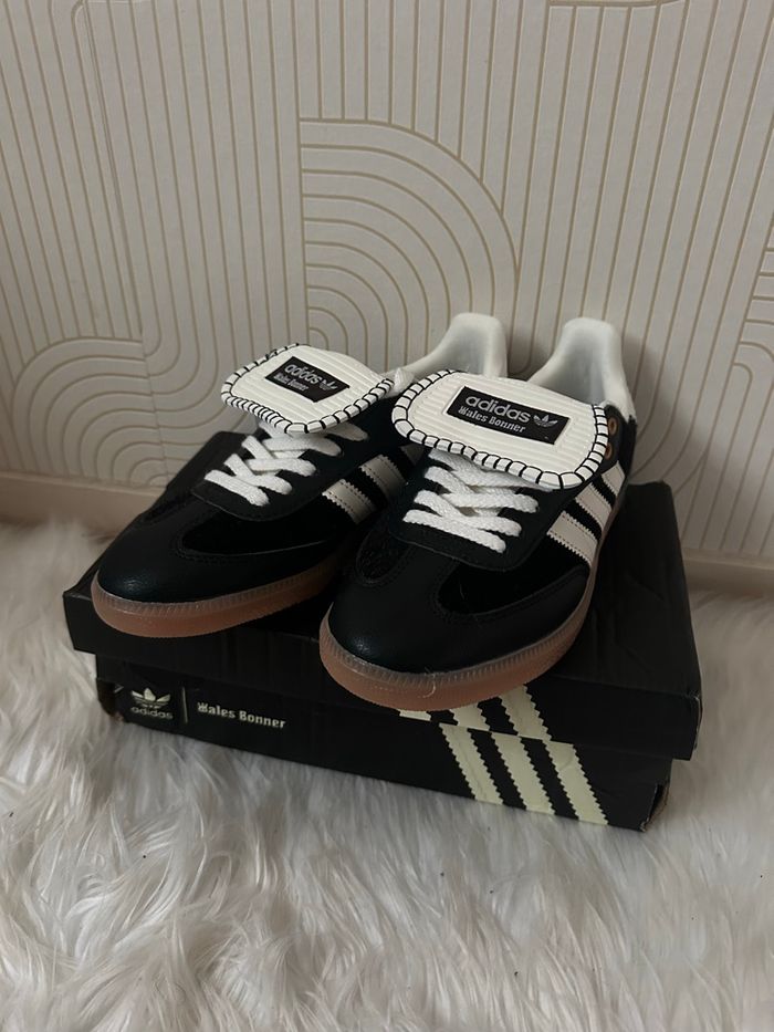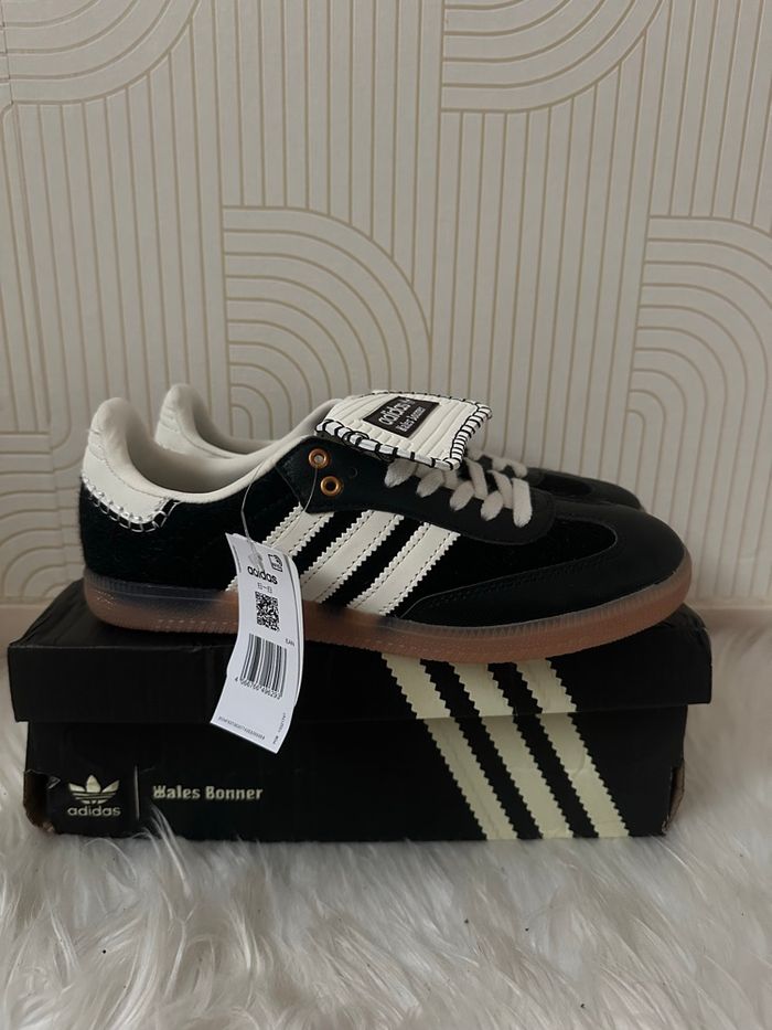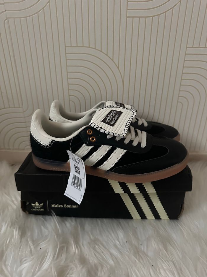 État : neuf Pointure : 41 Couleur : noir / blanc / semelle gomme Modèle élégant et original avec bout légèrement pointu, coloris noir avec les trois bandes blanches iconiques Adidas. Semelle gomme marron pour un style rétro tendance. Languette oversize avec logo Adidas & Wales Bonner brodé, finitions soignées et détails premium. Vendues avec leur boîte d’origine. Parfaites pour un look streetwear chic ou casual sophistiqué.