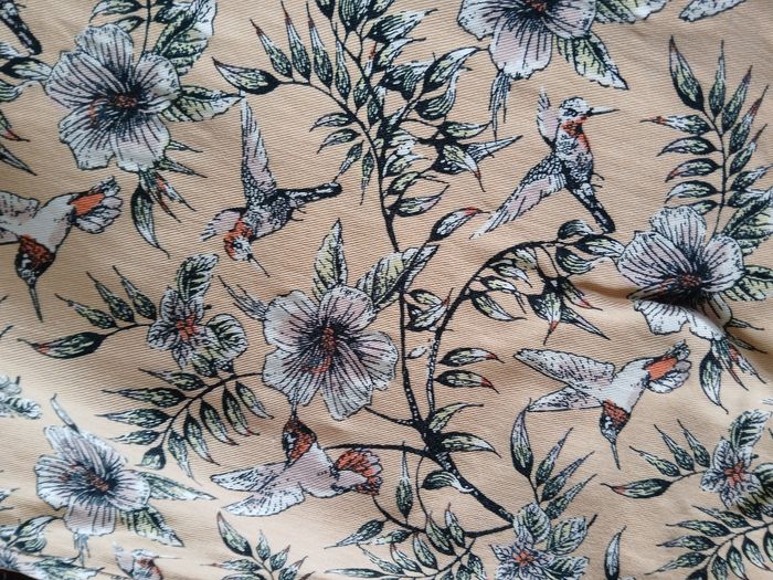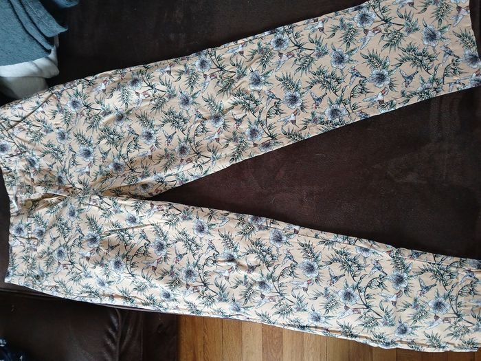 Pantalon avec motif estival très mignon mais trop grand. Il s'est un peu détendu après les lavages.