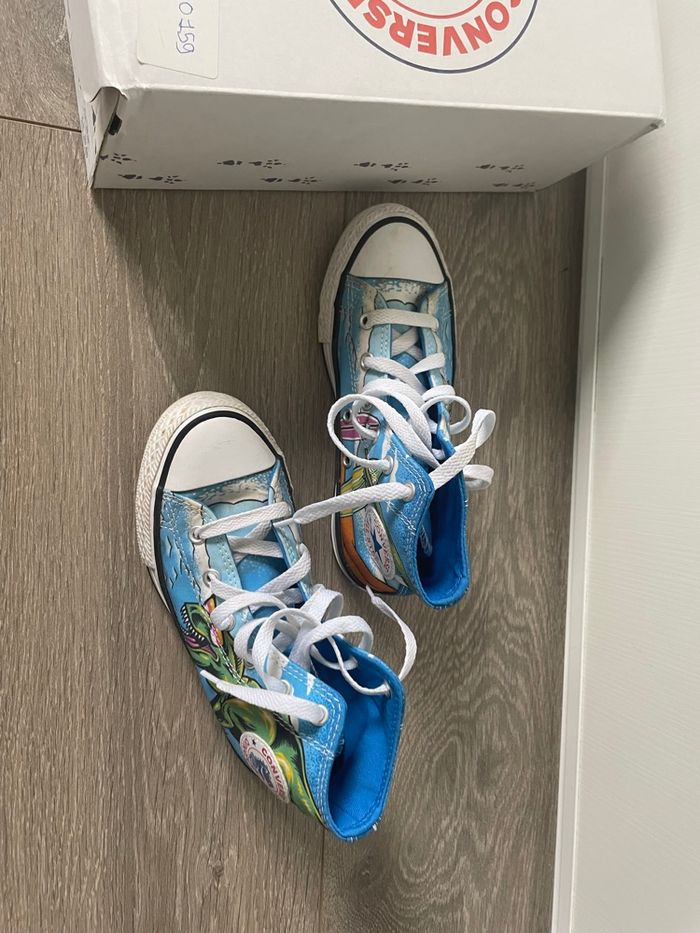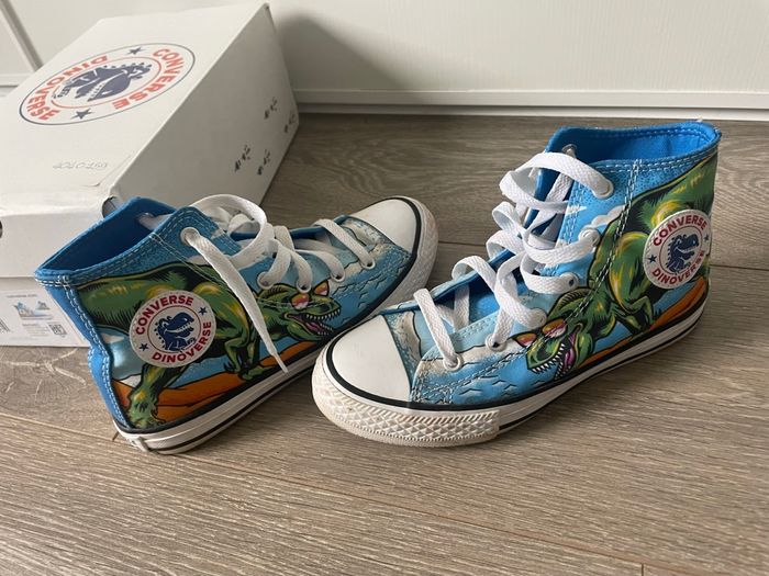 Rare et collector Converse Dinosaures Dinos Pointure 32 Avec boite d’origine Portées 3 sous tout au plus Ps: malheureusement le plastique blanc des converses marque immédiatement Cf photos