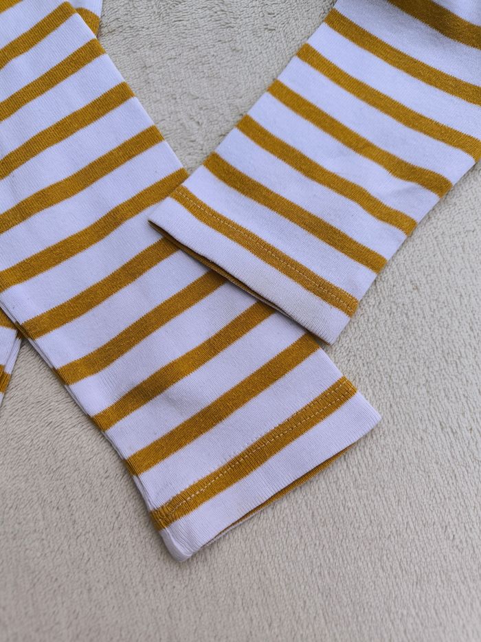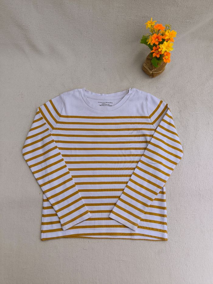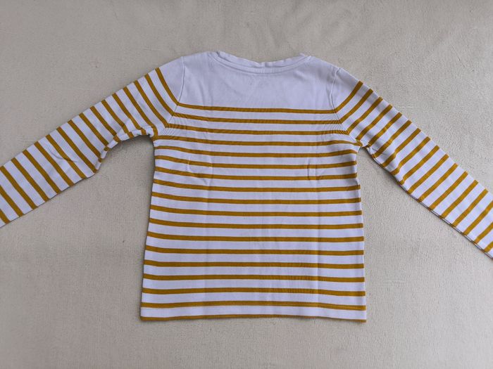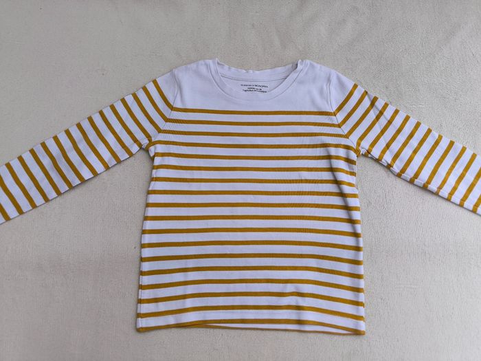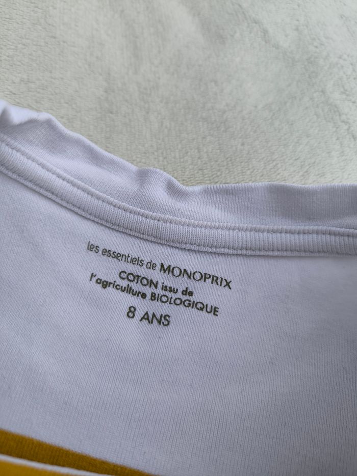 T-shirt à manches longues Marque Monoprix Taille 8 ans • Coloris blanc, moutarde • Rayures horizontales style marinière • Col rond • Coton fin • Petite tache sur le côté En très bon état #evelyne_filles_8ans #evelyne_filles