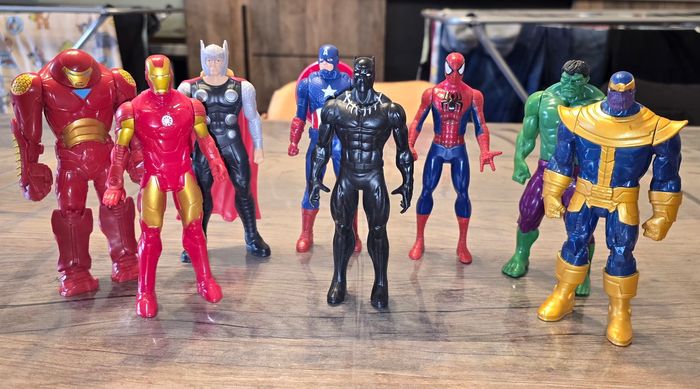 Lot de 8 figurines Marvel. Le lot contient Captaine America, Thor, Iron Man, Hulkbuster d’Iron Man, Spiderman, Hulk, Tanos et Black Panthère