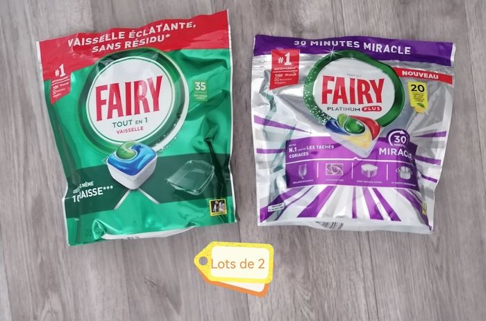 Cause plus de lave vaisselle : 2 paquet de fairy. 1) fairy tout en un 475g = 35p 2) fairy platinum plus 329g = 20 p Soit au total 55 p. Le lots 12€