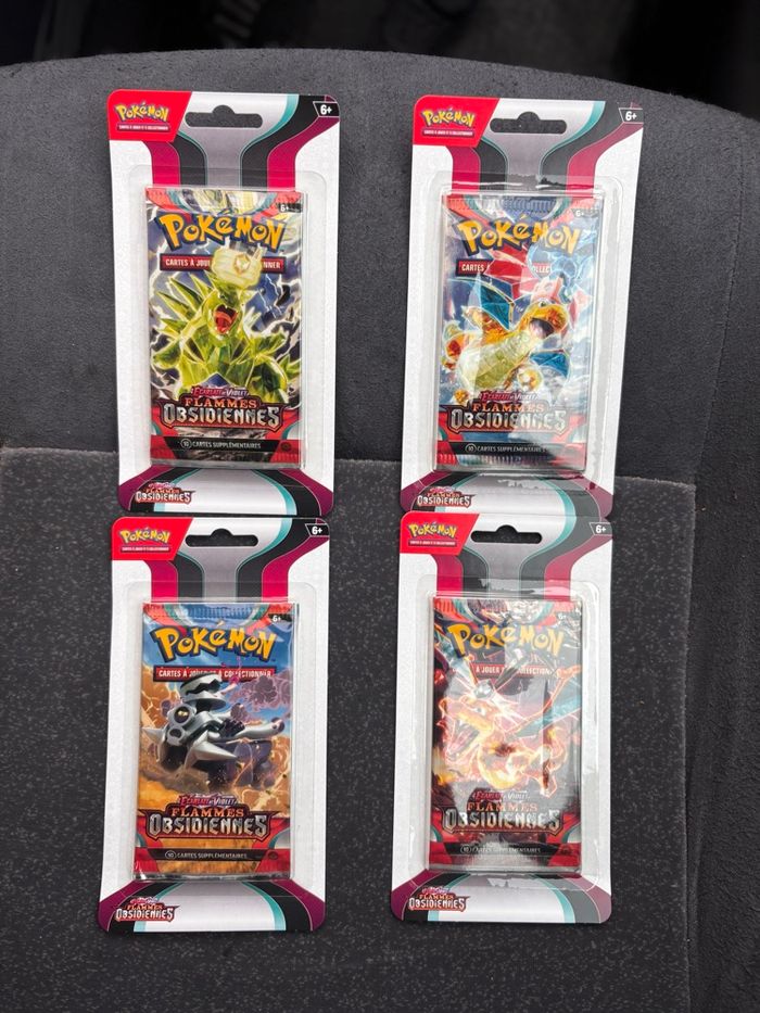 4 boosters Flammes Obsidiennes Écarlate et Violet en artset Boosters neufs et scellés, condition 10/10, pour plus de photos n’hésitez pas ! Envoi rapide et sécurisé, en 24h maximum après la commande 😉