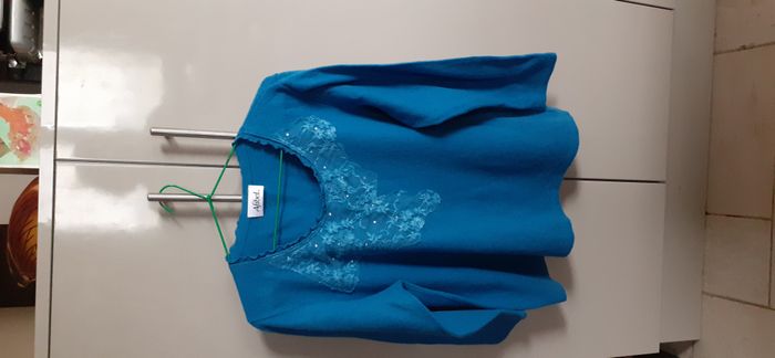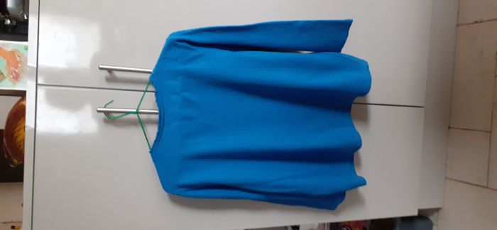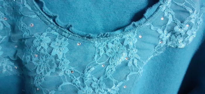 Pull femme "Afibel" taille 50 Couleur: bleu canard avec broderie et perles brillantes sur le devant Largeur épaules: 43 cm Longueur: 63 cm 75% laine, 20% polyamide et 5% élasthanne En excellent état, comme neuf