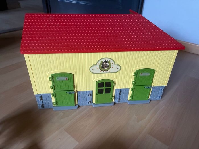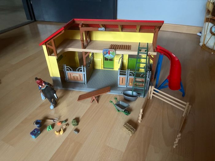 Ferme de la marque Schleich vendue avec tous les accessoires qu’il y a sur la photo. Pour l’envoie la ferme est démontée mais la notice est présente pour la remontée sans problème Petit impact sur le toit de la ferme (voir photo)