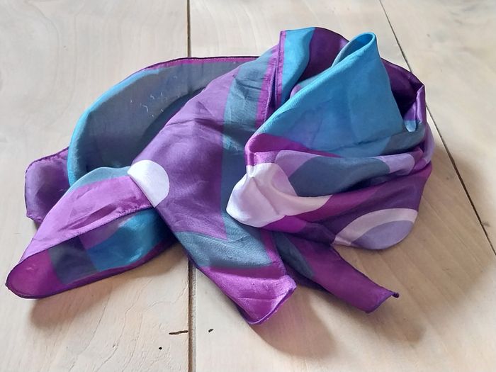 Foulard femme carré motifs géométriques vintage imension: 77X77cm Comme il s'agit d'un article vintage, seconde main, dans son jus vu son âge. Produit d’occasion. Les photos montrent le produit tel qu’il sera livré avec ses défauts et ses manques éventuels. Bon état générale.